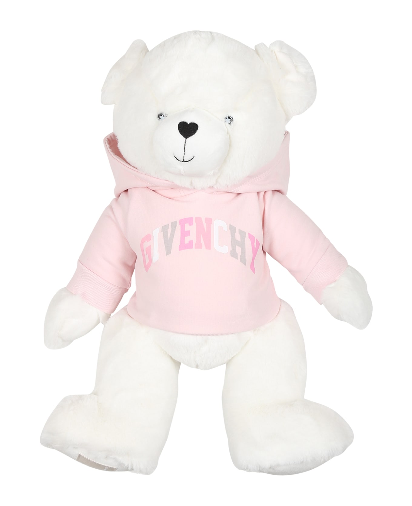 Ivory teddy bear with pink fabric sweatshirt, with hood. It is embellished with logo on the front. 40 x 30 x 22cm.