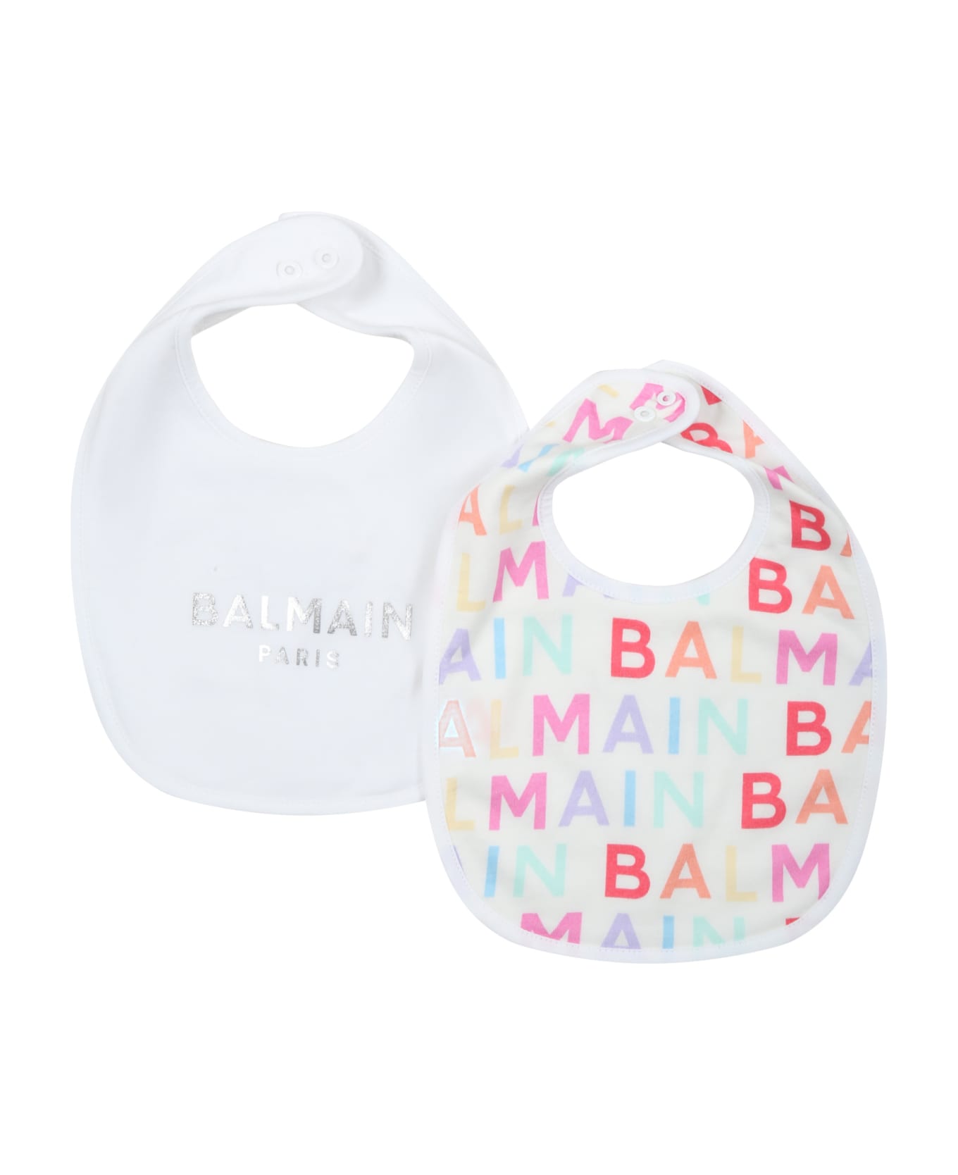Set composed of two white cotton bibs, with snap button closure on the back. One is embellished with silver logo on the front, the other one is embellished with all-over multicolor logo.