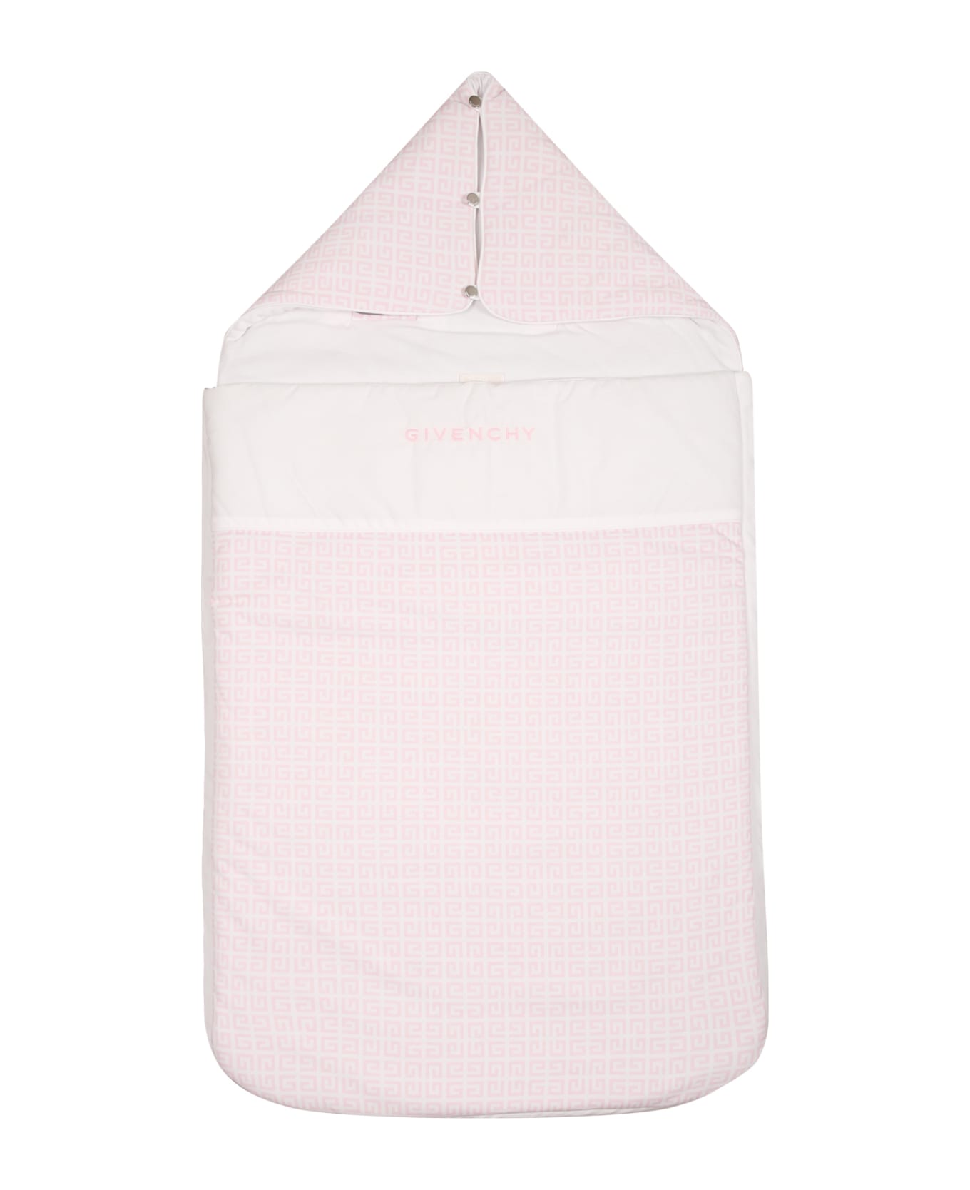 White cotton sleeping bag, zip closure. It is embellished with all-over pink monogram, logo embroided on the front.