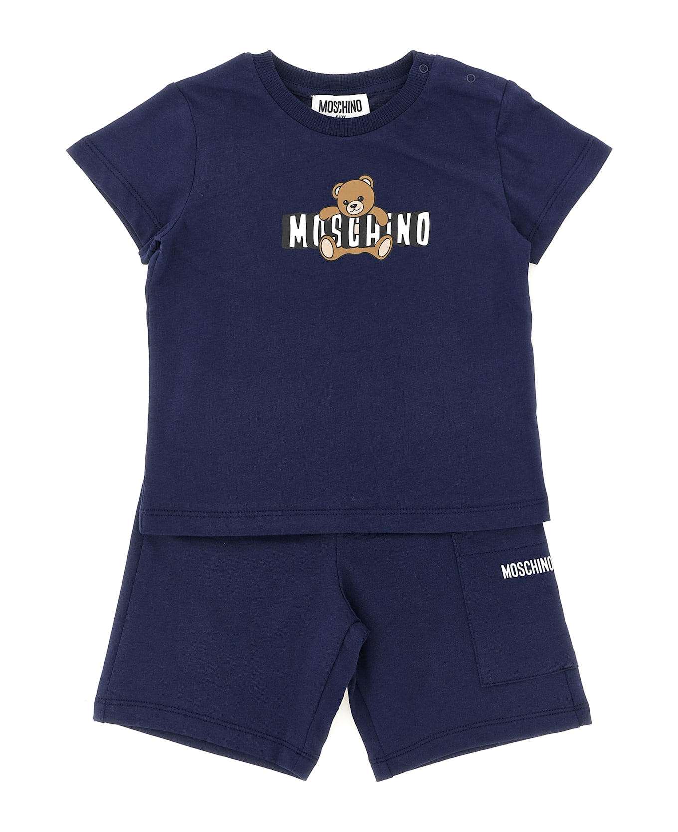 Cotton jersey suit consisting of crewneck t-shirt, front 'Moschino Teddy Bear' print, snap buttons on the left shoulder, short sleeves, Bermuda shorts with elastic waistband and cargo pocket with lettering logo print. Composition: 100% cotton