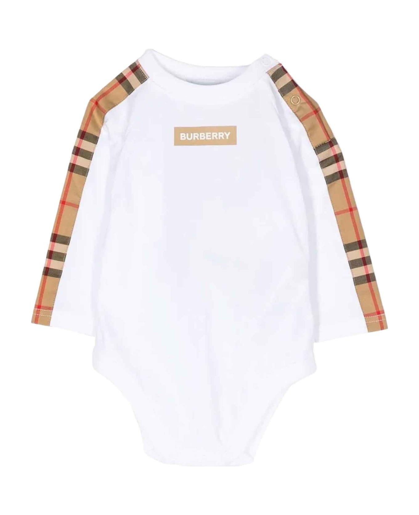 white bodysuit baby unisex. Logo print on the chest, round neckline, checked sleeves and concealed snap fastening. 100% Cotton