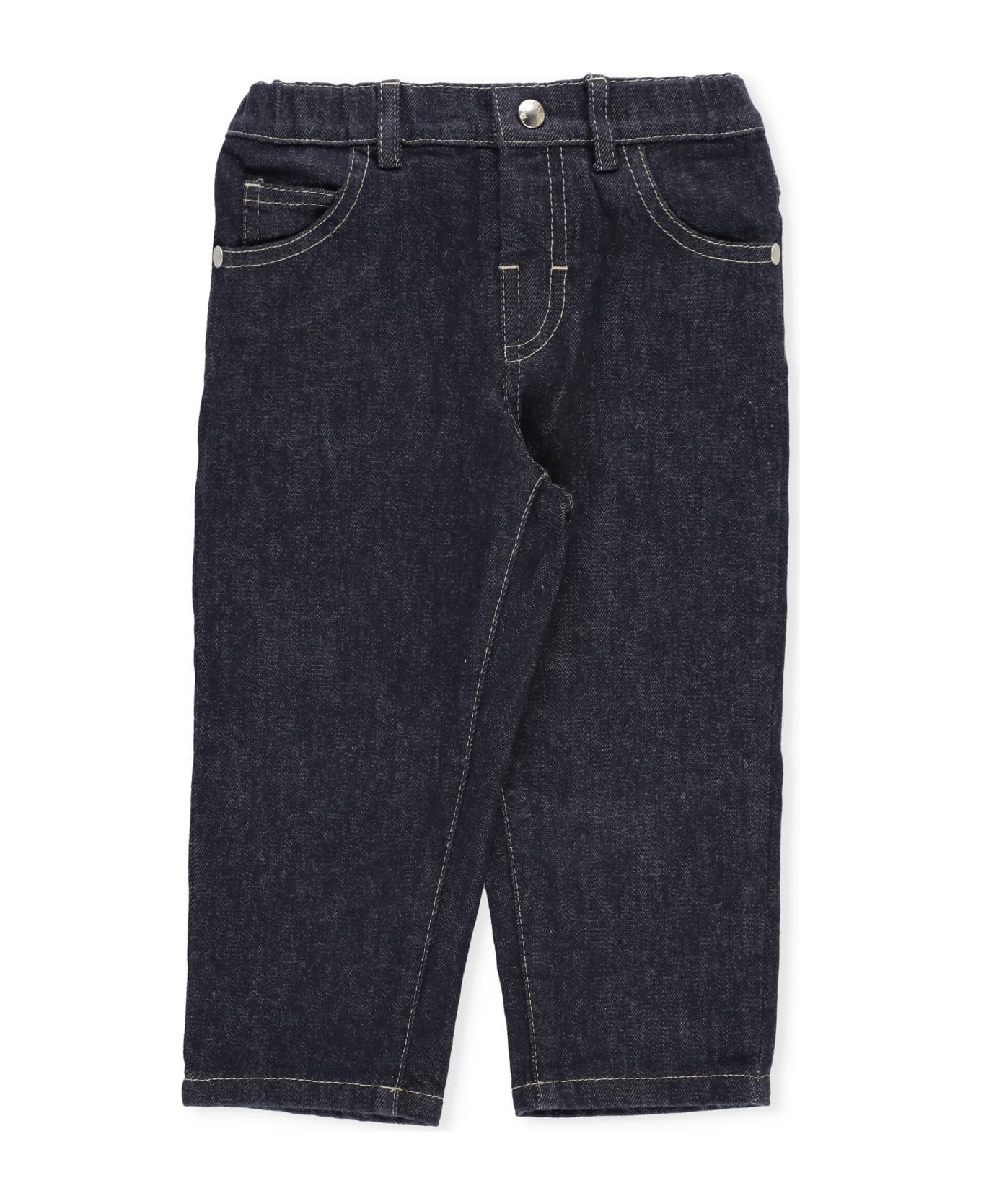 - Blue Moncler baby cotton jeans for boy - Elastic waist - Belt loops - Front snap button fastening - Five pockets - Rear contrasting color embroidered logo