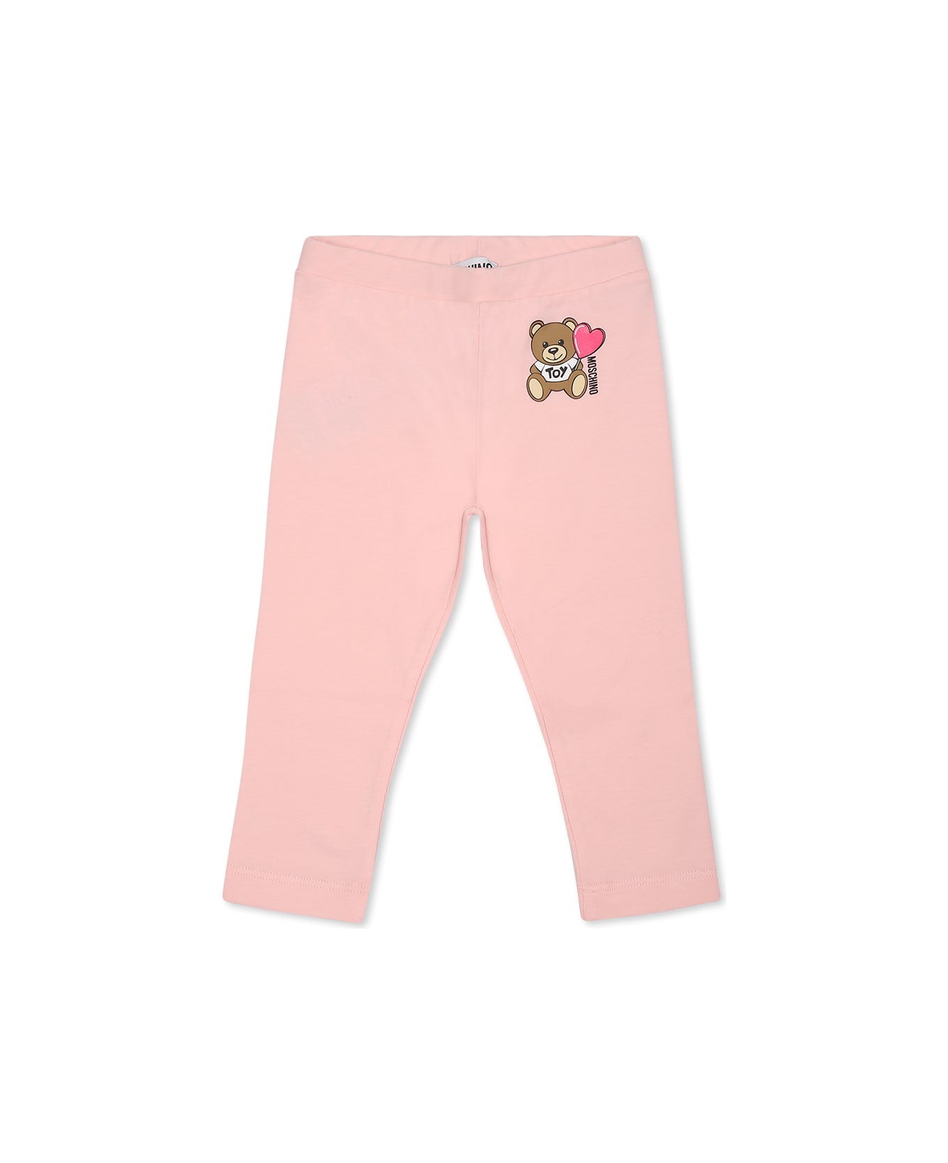 Pink leggings with elastic waist; embellished with Teddy Bear, heart and logo on the front.