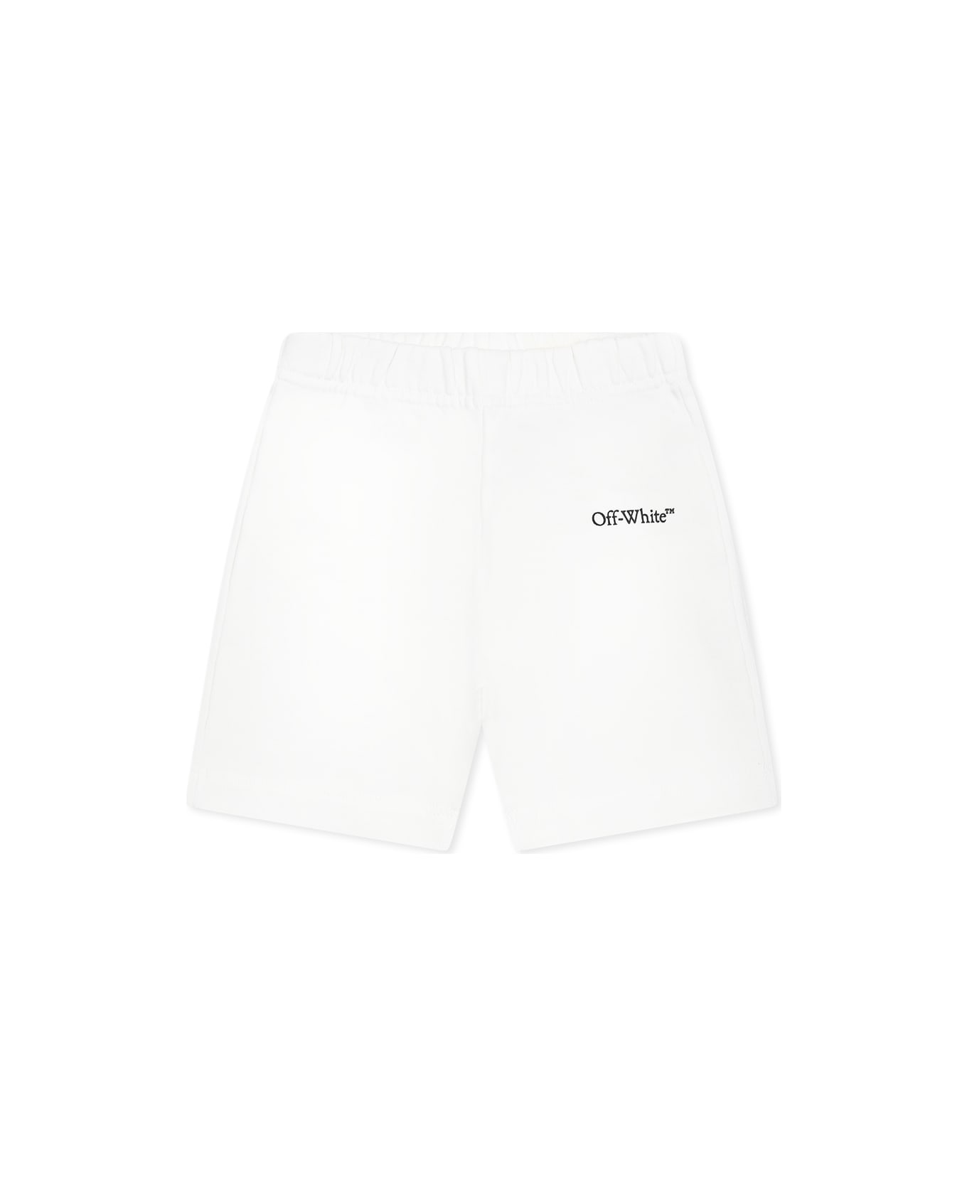 White shorts in brushed cotton, with elasticated waist. They are embellished with a black logo on one leg.