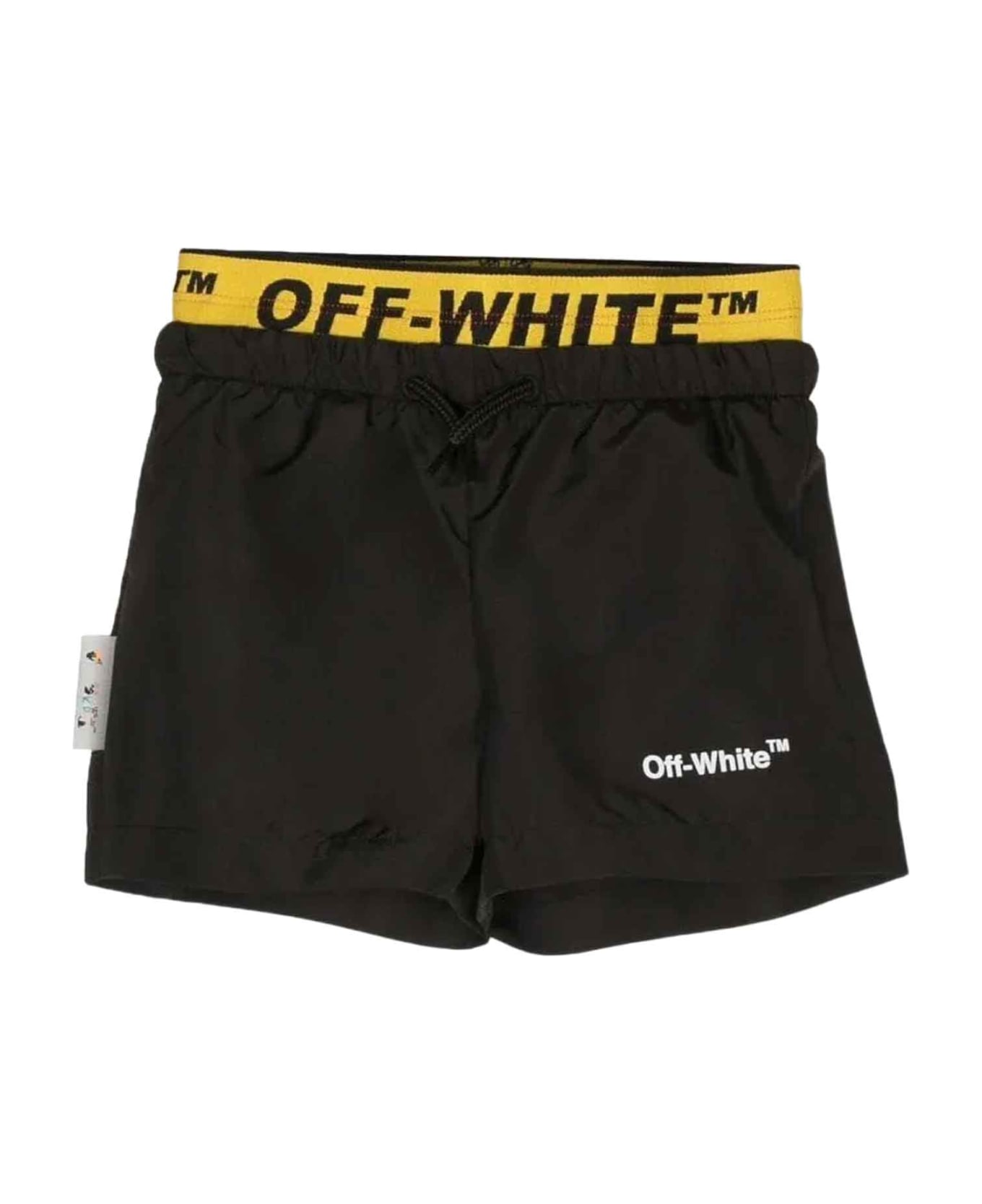 black swimsuit boy. Logo print on the leg, logo waistband and elasticated waistband. 100% polyester
