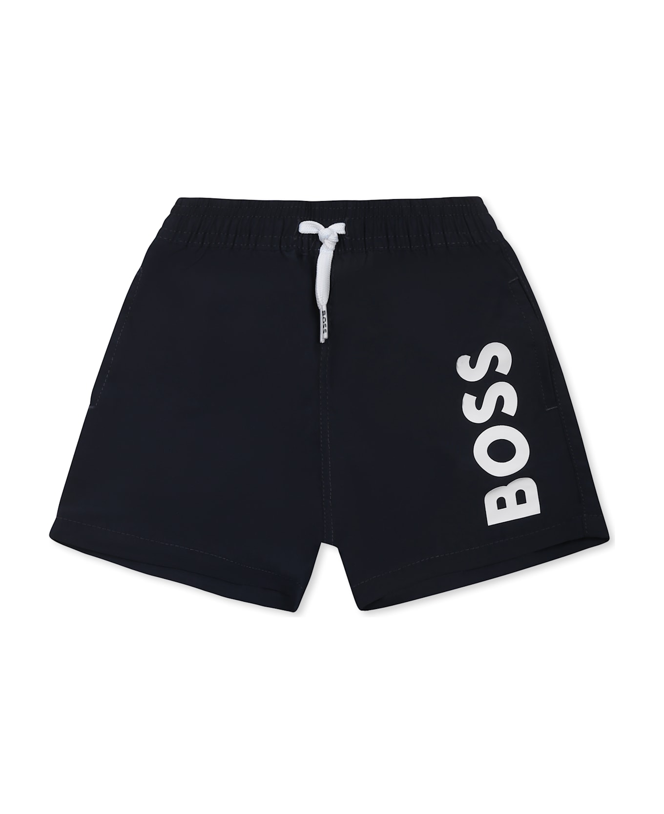Blue swim shorts with elasticated waist, drawstring and side pockets. It is embellished with white logo print on one leg.