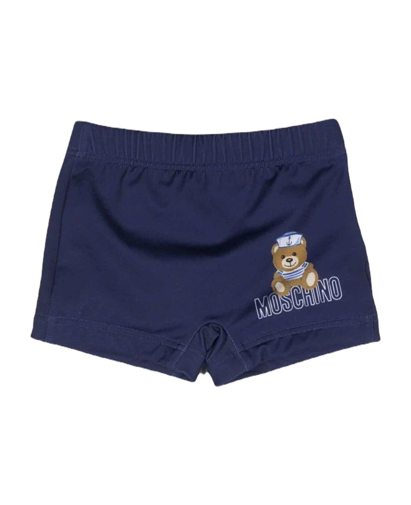 blue swimsuit baby unisex. elasticated design, elasticated waist, signature teddy bear pattern and logo print on front. Polyester 77%, Elastane 23%
