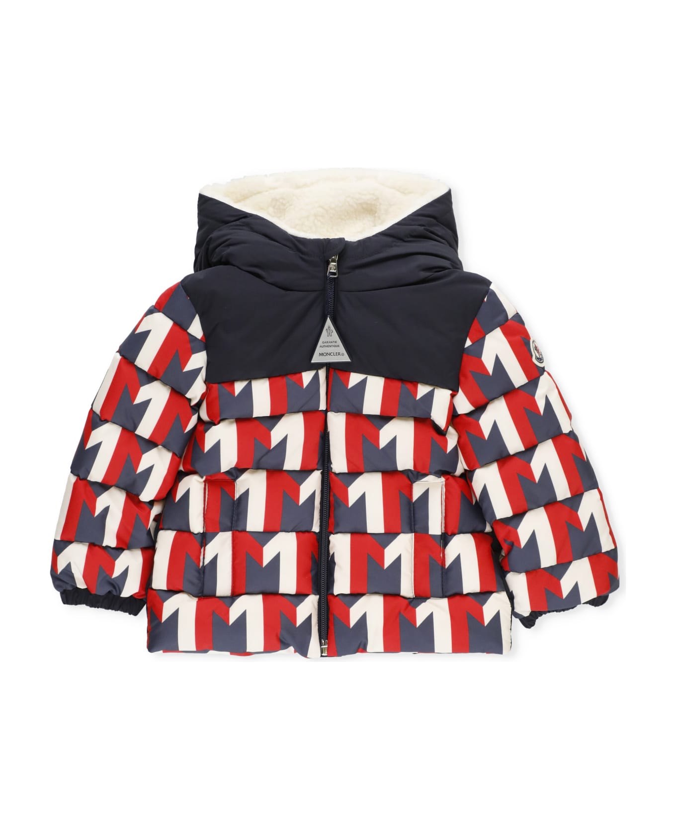 - Multicolor Moncler Baby down jacket for boy - High neck - Hood - Long sleeves with elastic at hem - Contrasting colour logoed patch at left sleeve - Front zip fastening - Two slit pockets with button - All-over monogram