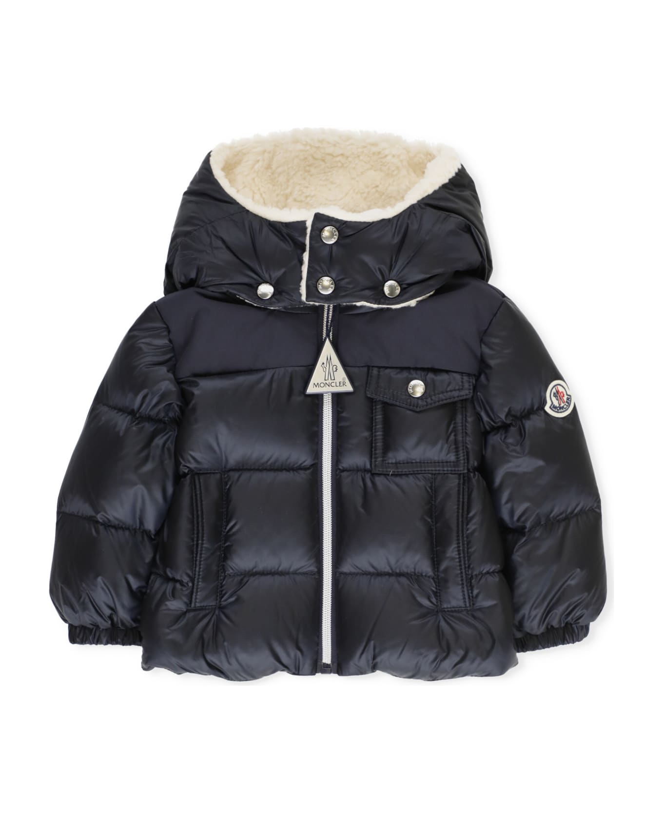 - Blue Moncler Baby down jacket for boy - Removable buttons hood - Long sleeves with elastic at hem - Loged patch at left sleeve - Two front button pockets