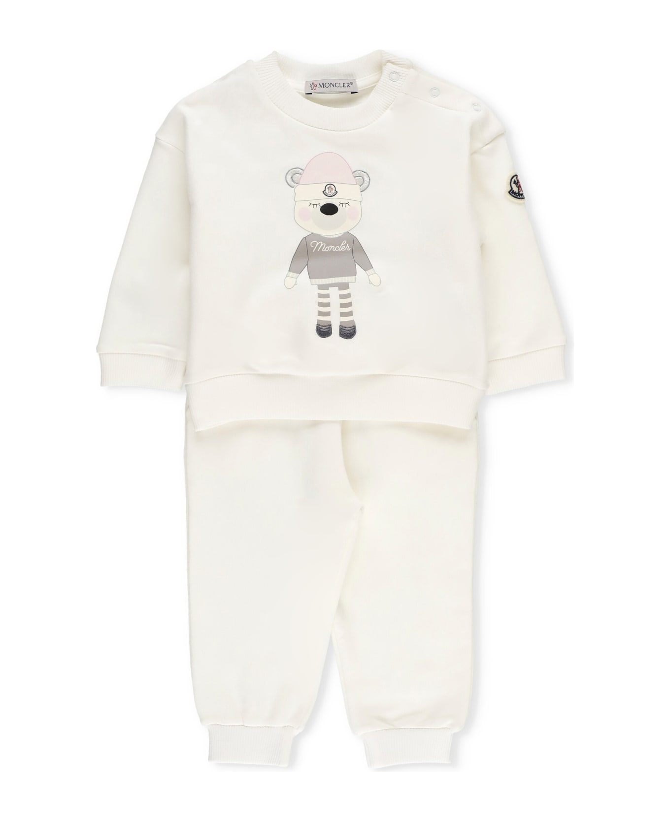 - Ivory Moncler Baby cotton sweatshirt for girl - Crew neckline with buttons - Long sleeves - Contrasting color logoed patch at sleeve - Elastic ribbed trims - Front contrasting color printed logo - Elastic waist - Two side pockets
