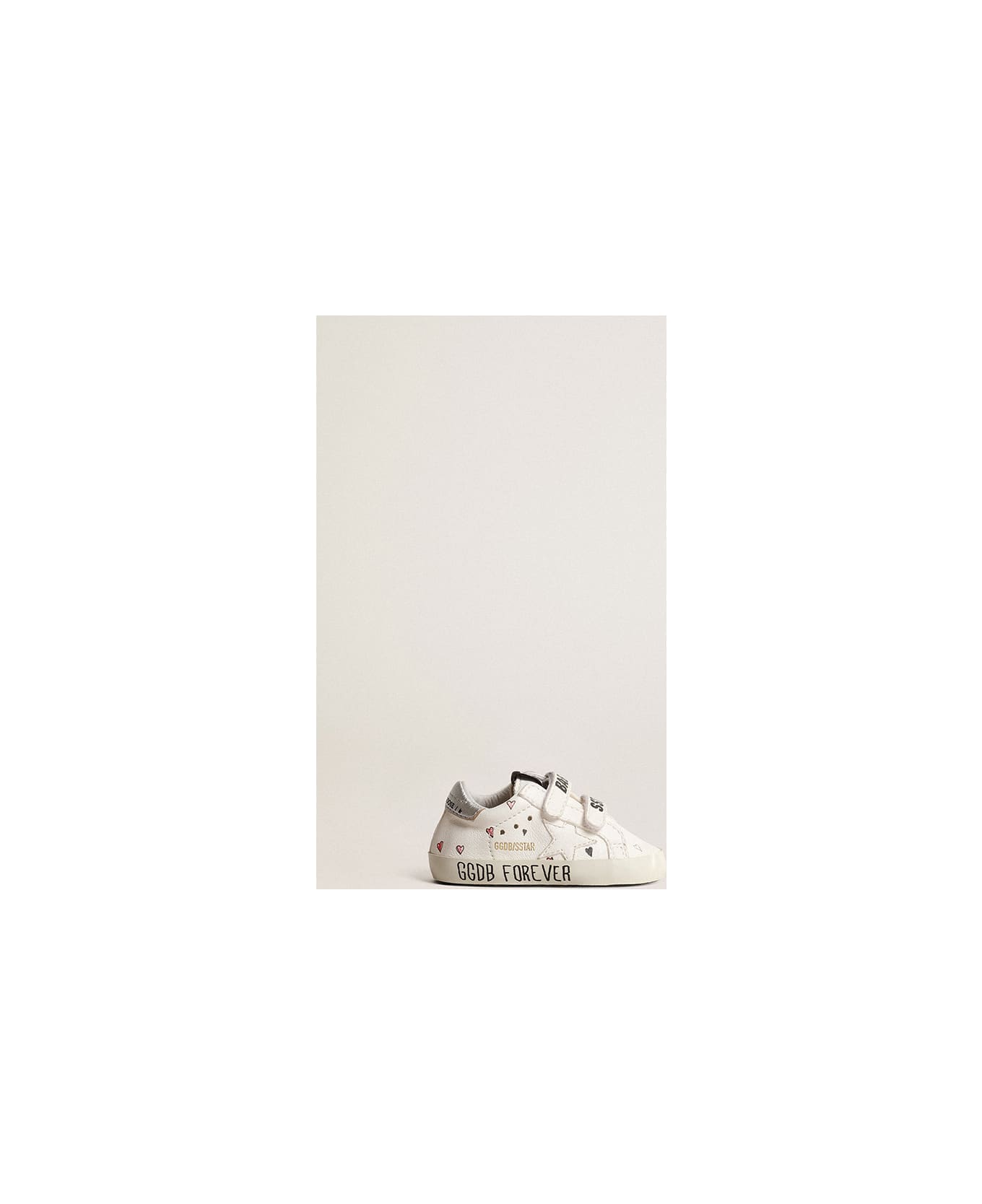 Old School sneaker in the Baby version, equipped with two bands with velcro closure on the front with contrasting logo. Model with upper in white nappa leather with red heart print, star in white nappa leather, and for the heel tab in silver-colored laminated leather.