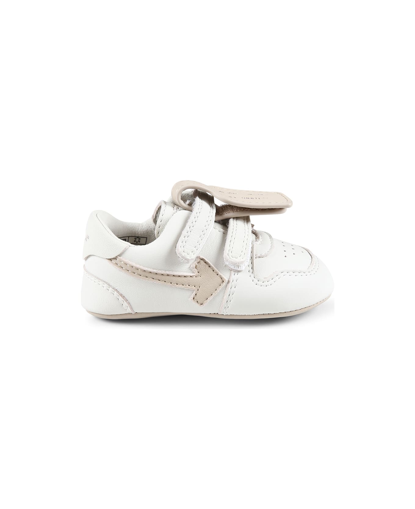 White leather sneakers, with velcro fastening. They are embellished with iconic beige arrow on the sides, zip tie and logo on the back.