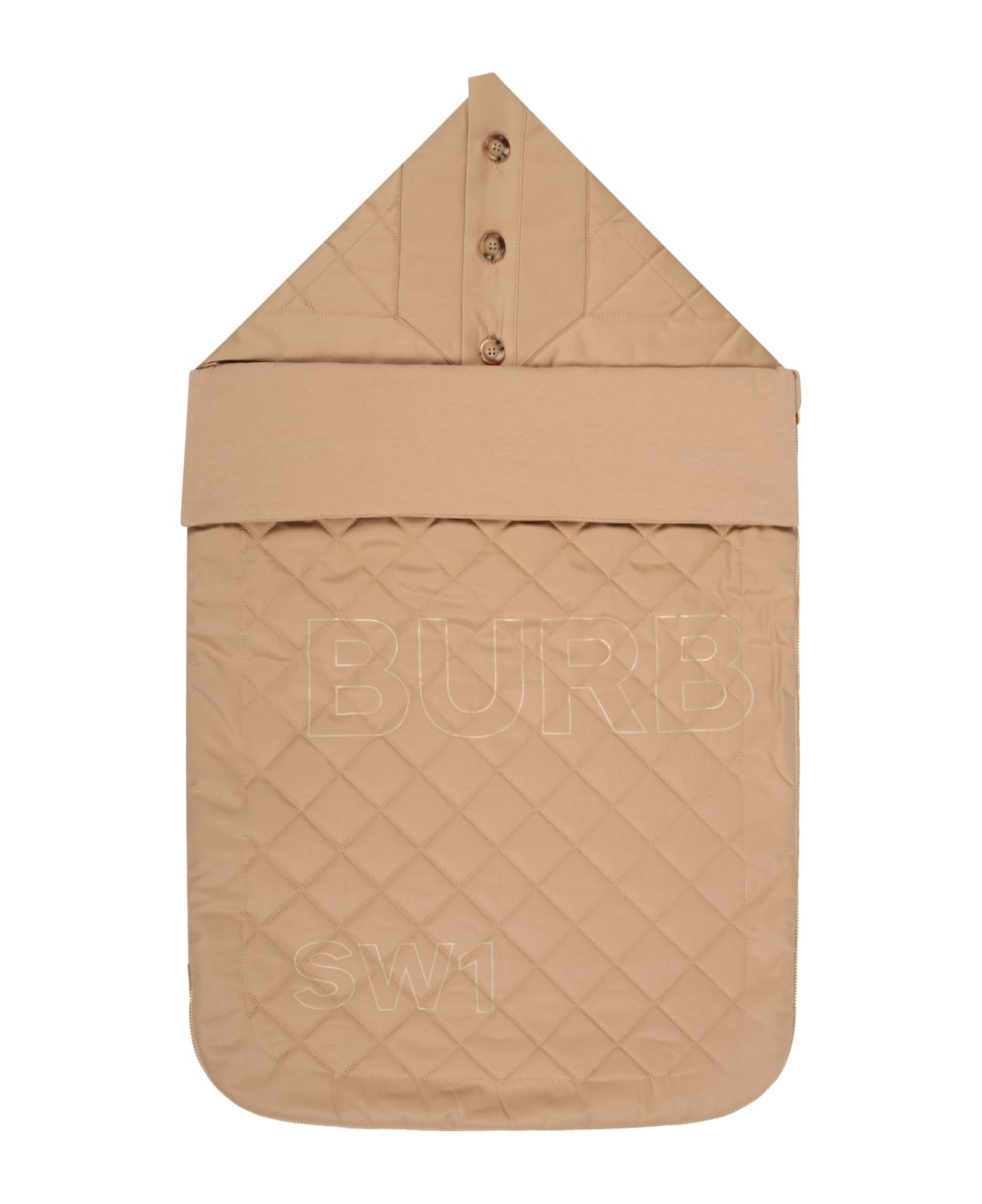 Beige quilted sleeping bag, with turn-up, zipped closure on the side and hood with buttons. It s embellished with logo on the front and back.