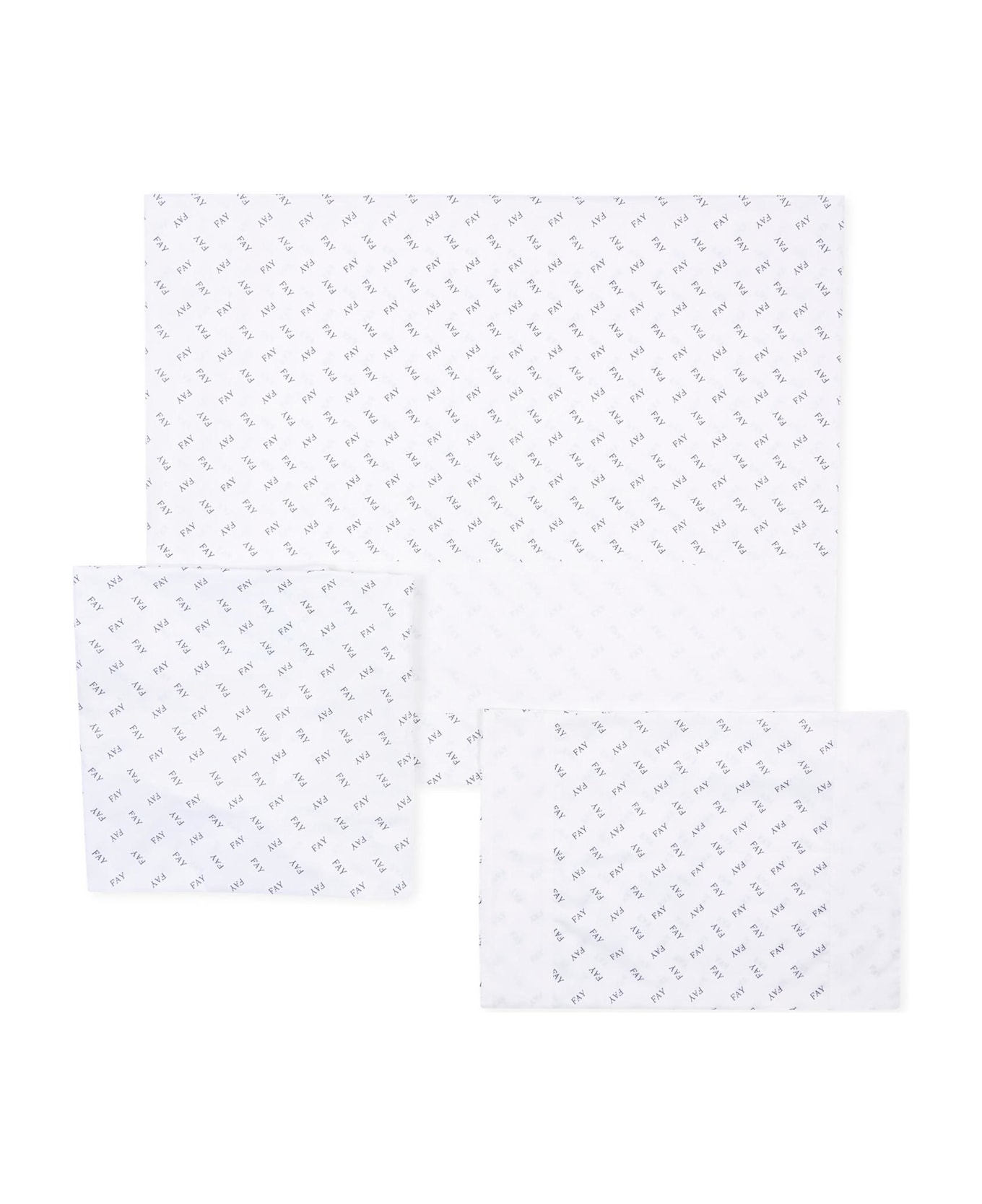 White cotton sheet set consisting of a fitted bottom sheet, top sheet, and pillowcase. It is embellished with an all-over blue logo. Pillowcase dimensions (W x H): 40 x 29 cm; Flat sheet dimensions (W x H): 84 cm x 108 cm; Fitted sheet dimensions (W x H): 50 cm x 66 cm.