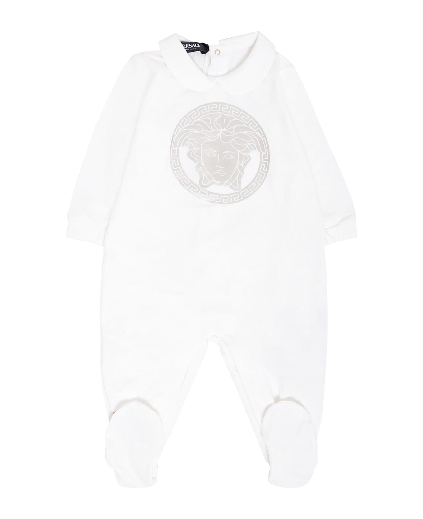 Ivory babygrow, made from soft cotton jersey, with long sleeves, rounded collar, feet, elastic cuffs and closure with clip buttons between the legs and on the back; it is embellished with printed platinum signature Medusa on the front.