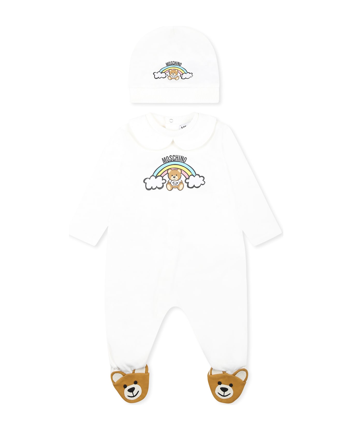 Moschino Kids ivory babygrow set, in brushed cotton, consisting of romper and hat. Long-sleeved babygrow, with ribbed crew neck, peter pan collar, feet with Teddy Bears and snap button closure on the back; hat with ribbed hem. It is embellished with Teddy Bear and rainbow on the front.