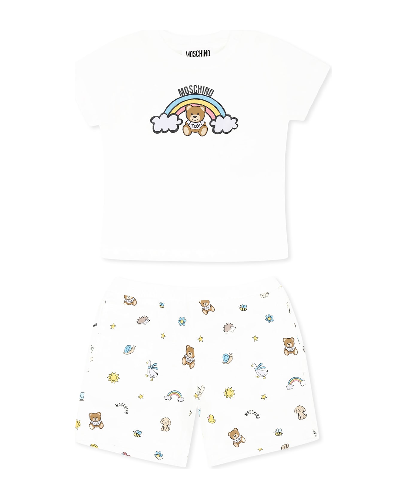 Ivory suit from the Moschino Kids brand, in cotton, consisting of a t-shirt and shorts. Short-sleeved t-shirt, with a ribbed crew neck and snap button closure on the shoulder; embellished with a Teddy Bear, rainbow and logo on the front. Shorts with an elasticated waist and side pockets, embellished with a Teddy Bear and an all-over print.