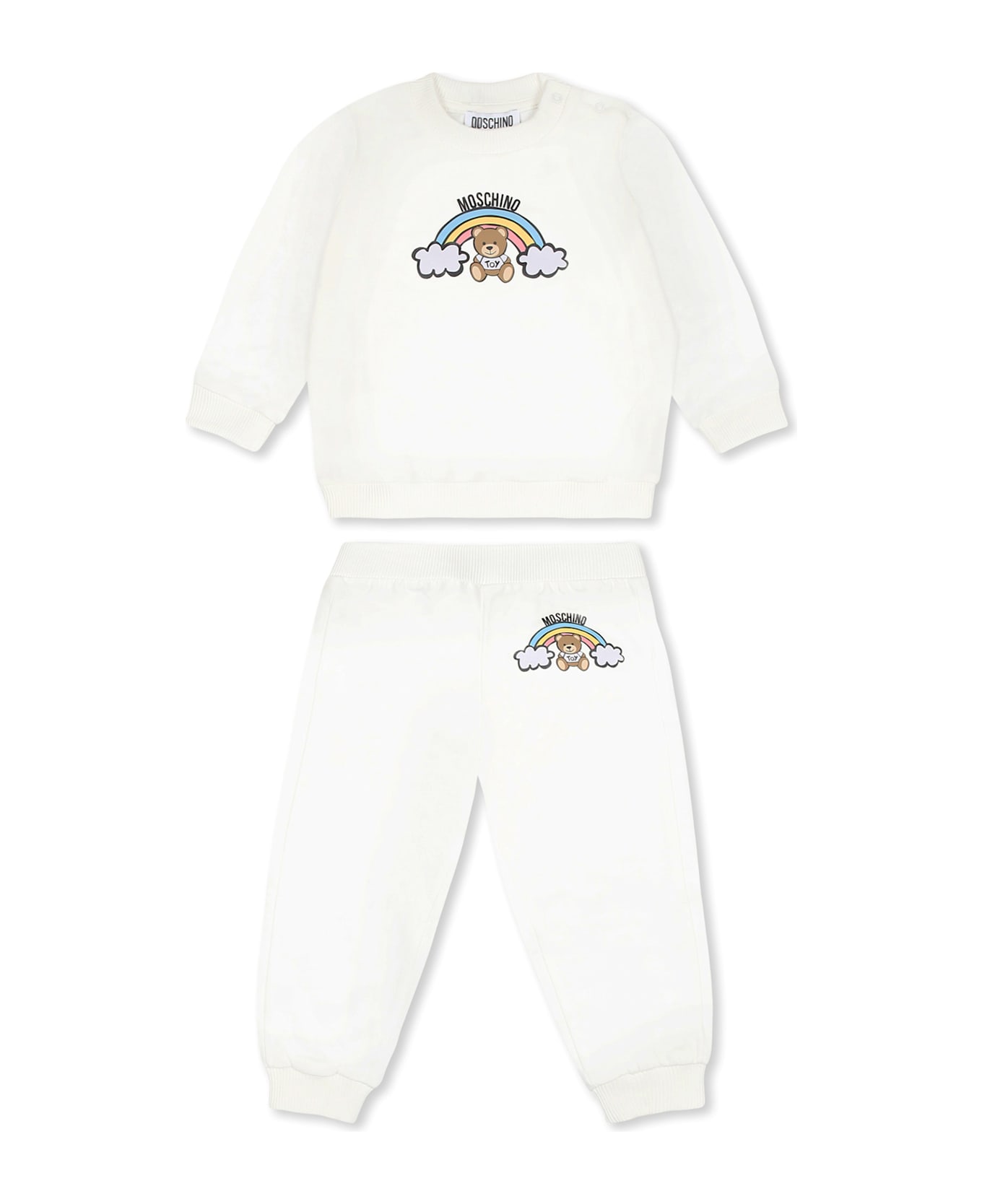 Ivory suit from the Moschino Kids brand, in brushed cotton, consisting of a sweatshirt and trousers. Long-sleeved sweatshirt, with ribbed crew neck, cuffs and hem; trousers with elasticated waist and ribbed ankles. It is embellished with Teddy Bear, rainbow and logo, on the front.