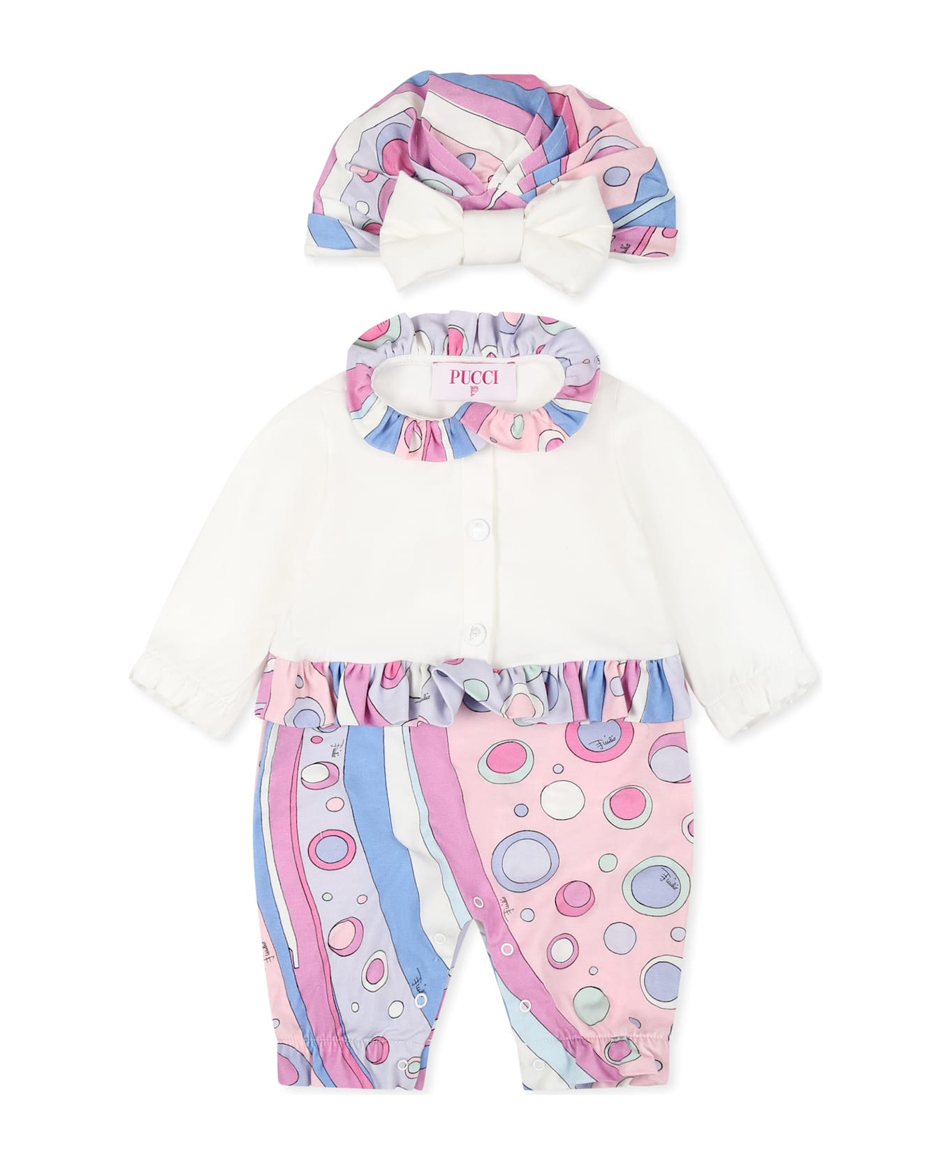 Multicolored birth set in cotton blend, consisting of a romper and hat. Romper with sleeves, crew neck, ruffles around the neck and waist, snap buttons on the front and between the legs, elasticated cuffs and hem; hat with bow applied on the front. It is decorated with a marble print.
