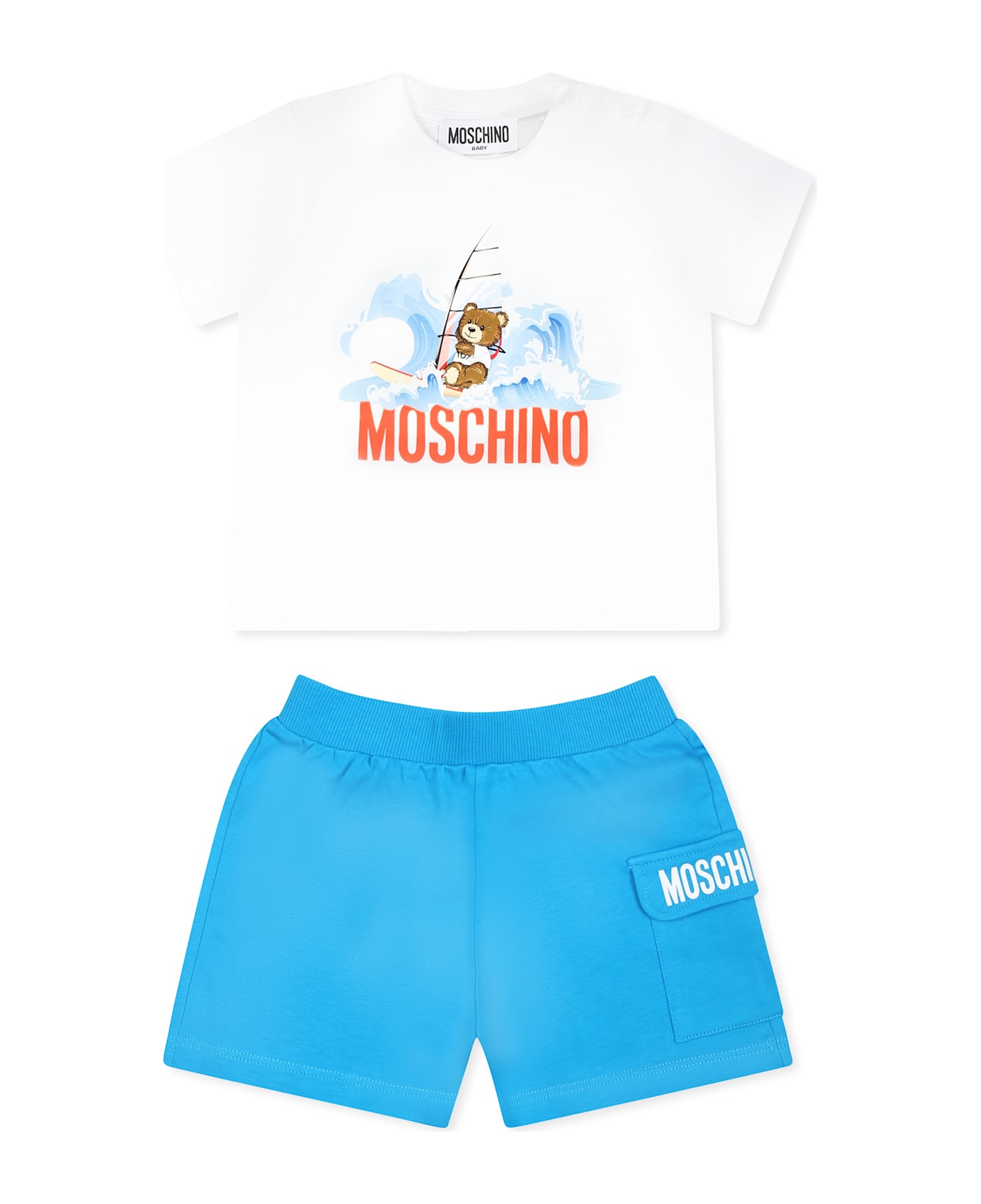 Multicolor suit from the Moschino Kids brand, in cotton, consisting of a t-shirt and shorts. T-shirt with short sleeves, ribbed crew neck and snap button closure on the shoulder; embellished with Teddy Bears, windsurfing board and logo, on the front. Light blue shorts with elastic waist and patch pocket on one side; embellished with side logo.