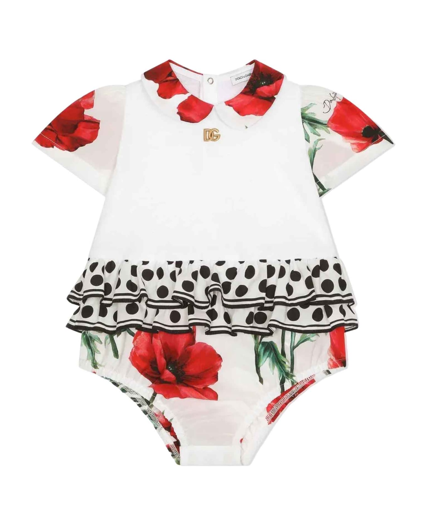 Red romper baby girl. Front logo embroidery, flower print, polka dot print, peter pan collar, short sleeves, back button closure, ruched hem and matching shorts. 100% Cotton