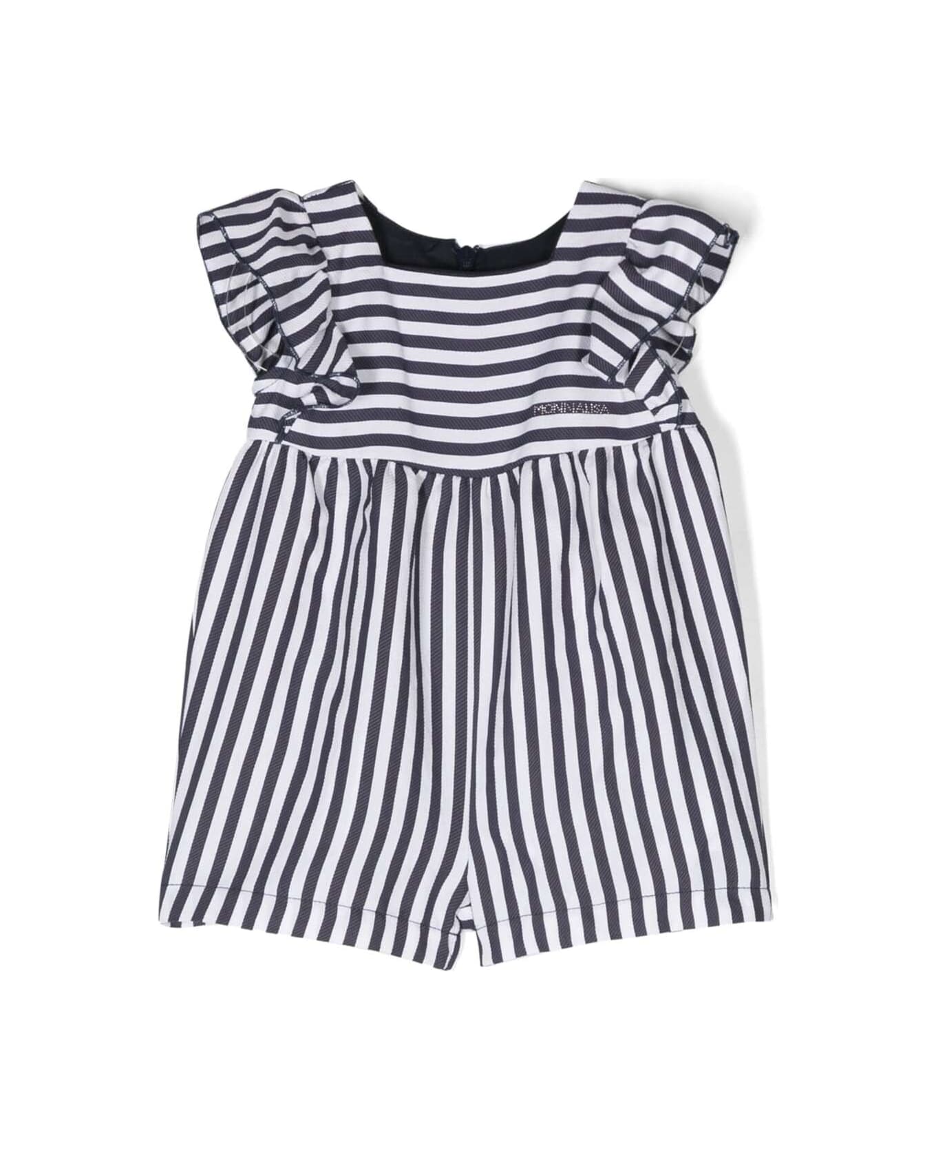 Onesie Crewneck Short ruffles sleeves All-over stripe motif Rear fastening with invisible zip Rhinestone logo detail at the front Blue and white Viscose blend Regular fit