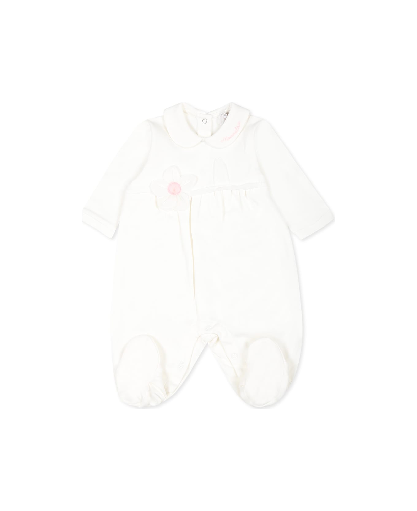 White cotton babygrow, long sleeves, with peter pan collar, feet, snap button closure on the back and between the legs. It is embellished with flower applied on the front and logo embroidered on the collar.