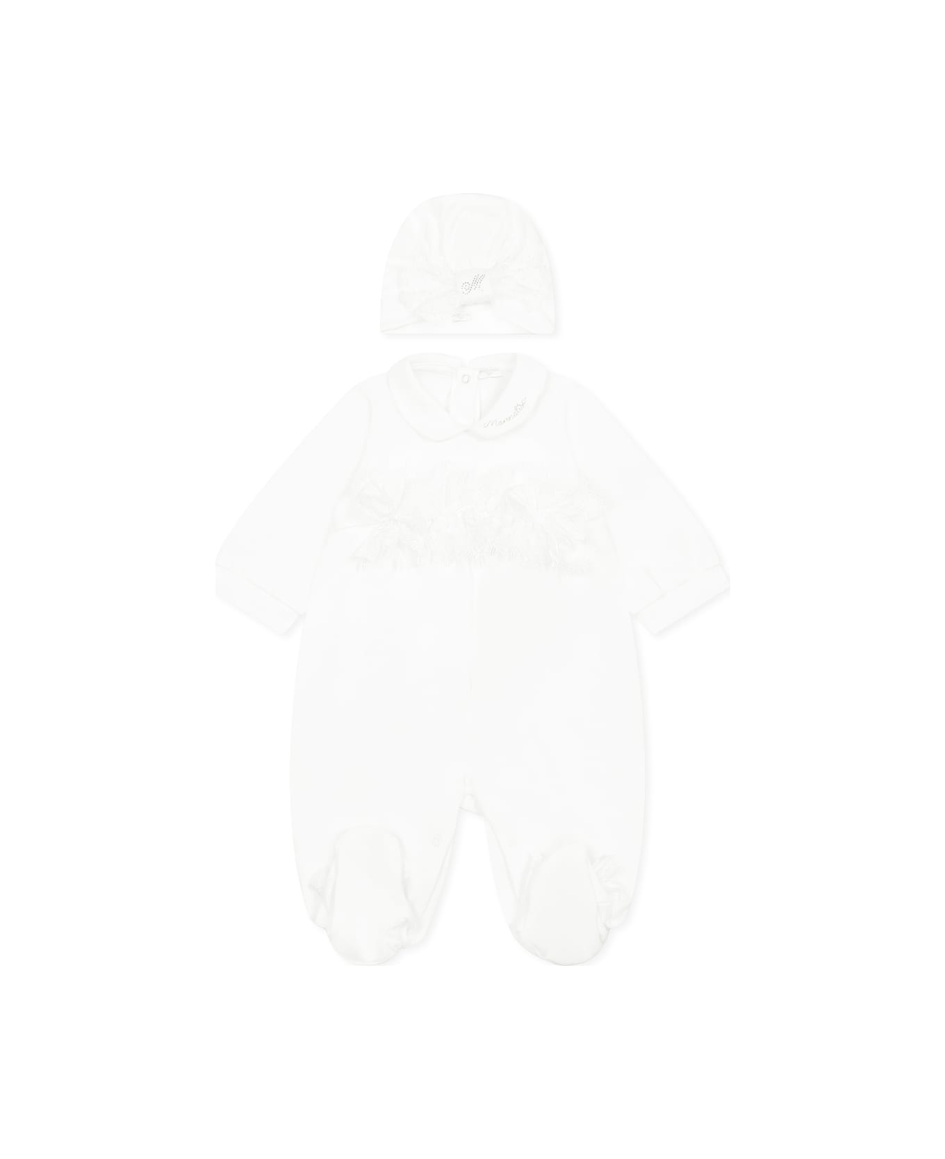 White cotton babygrow set, consisting of babygrow and hat. Long-sleeved babygrow, with peter pan collar, snap buttons on the back and between the legs, lace applique on the front and feet with bows. It is embellished with an embroidered logo. Bonnet with lace bow and rhinestone logo.