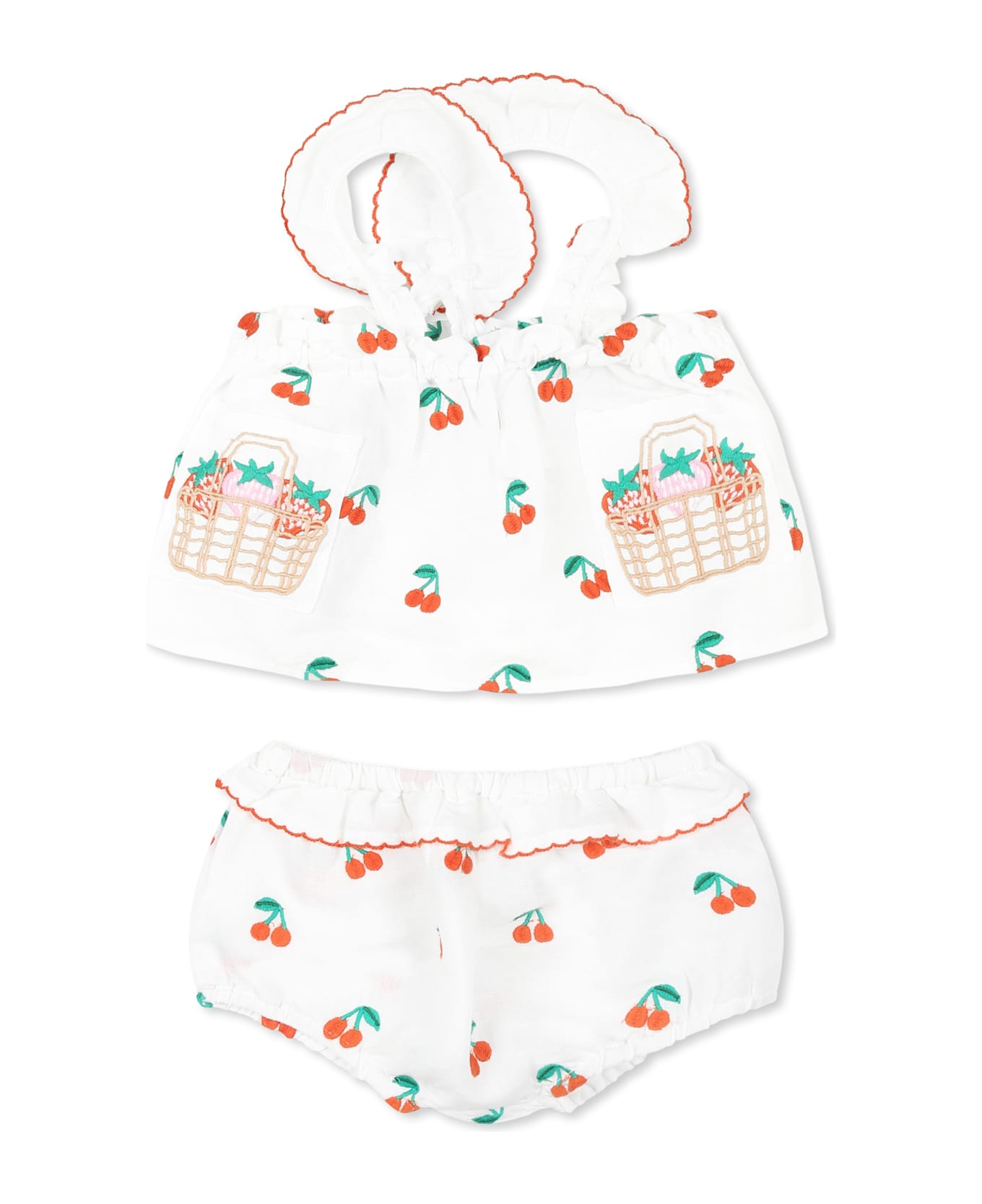White cotton and linen blend suit, composed of a top and shorts. Crop top with adjustable shoulder straps, buttons on the back and patch pockets on the front; shorts with elasticated waist and ruffles. It is embellished with all-over embroidered cherries and strawberries.