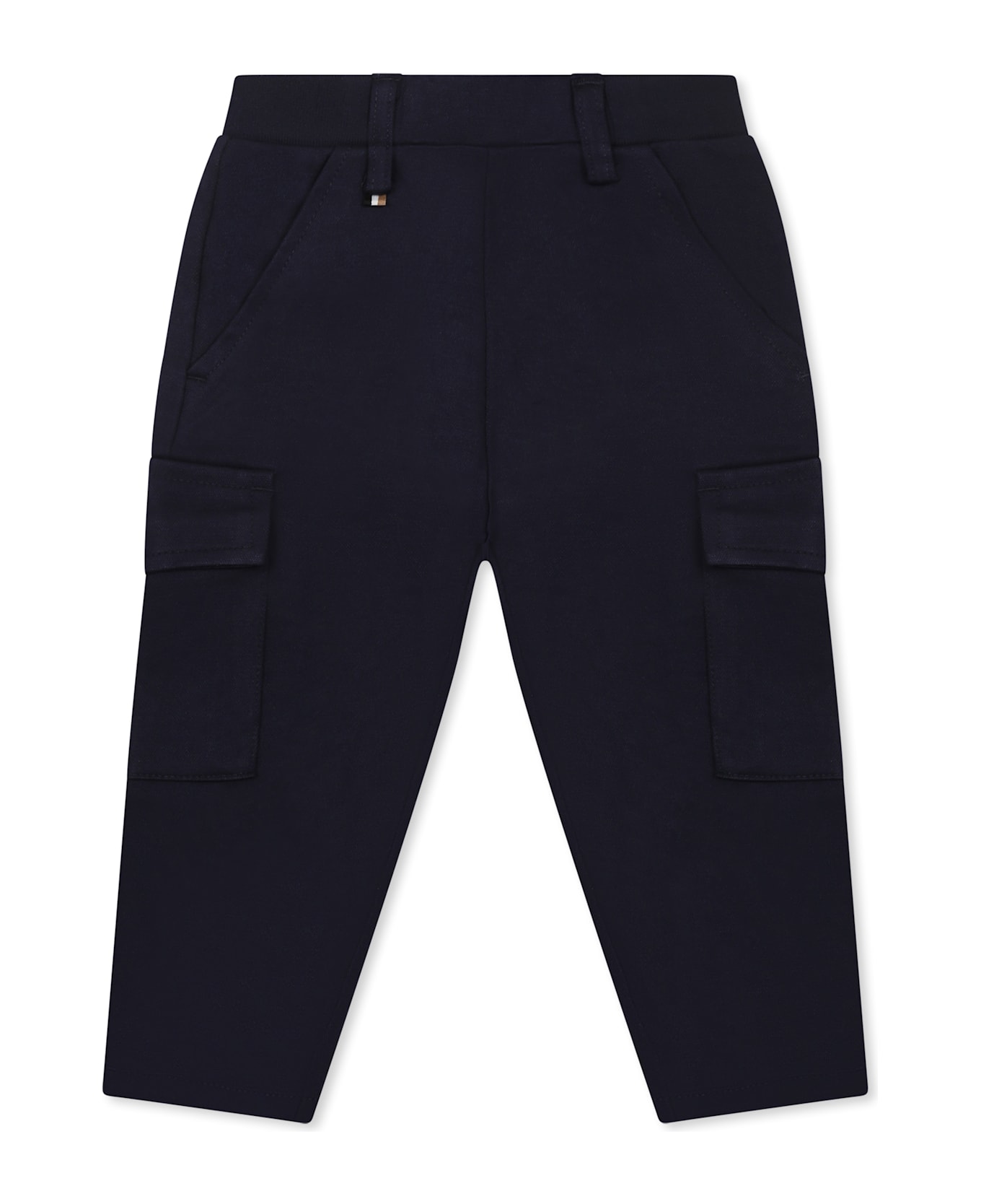 Blue cargo trousers, with elasticated ribbed waist, belt loops, welt pockets. They are embellished with flap pockets on the sides.