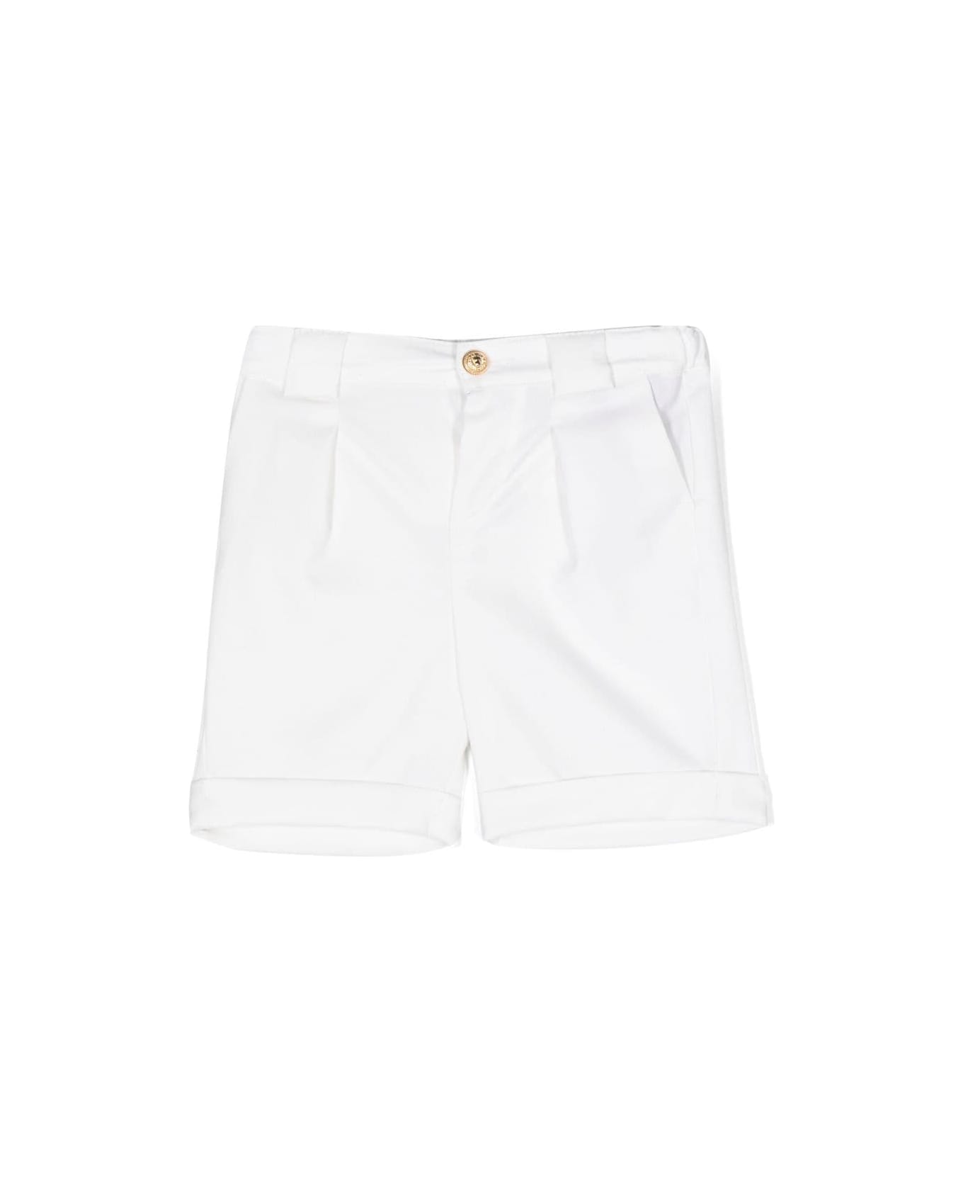 logo-patch virgin-wool shorts from Balmain Kids featuring cloud white, virgin wool, logo patch to the rear, belt loops, front button and zip fastening, two side slit pockets, two rear welt pockets, turn-up hem and above-knee length. Composition: Lana Vergine, 100%