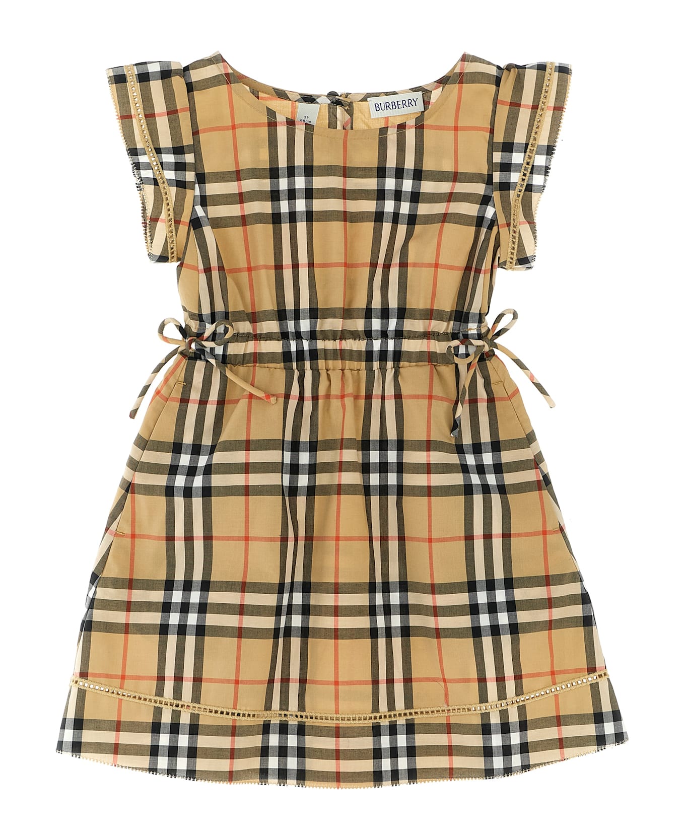 Light cotton 'Adele' dress woven with Burberry Check, tone-on-tone perforated embroidery, drawstring elastic waistband, round neckline with back button closure and teardrop cut-out detail, short sleeves, pockets. Composition: 100% cotton