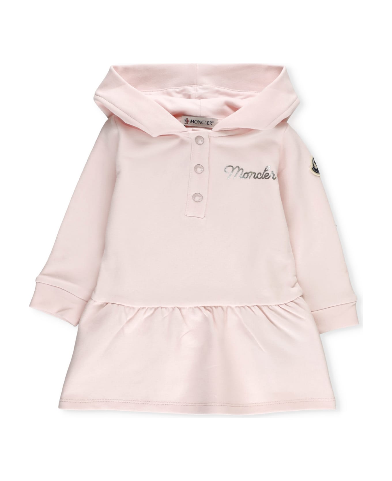 - Pink Moncler baby cotton dress for girl - Crew neckline with hood - Front snap buttons fastening - Front tone on tone logo - Long sleeves - Flounce at hem