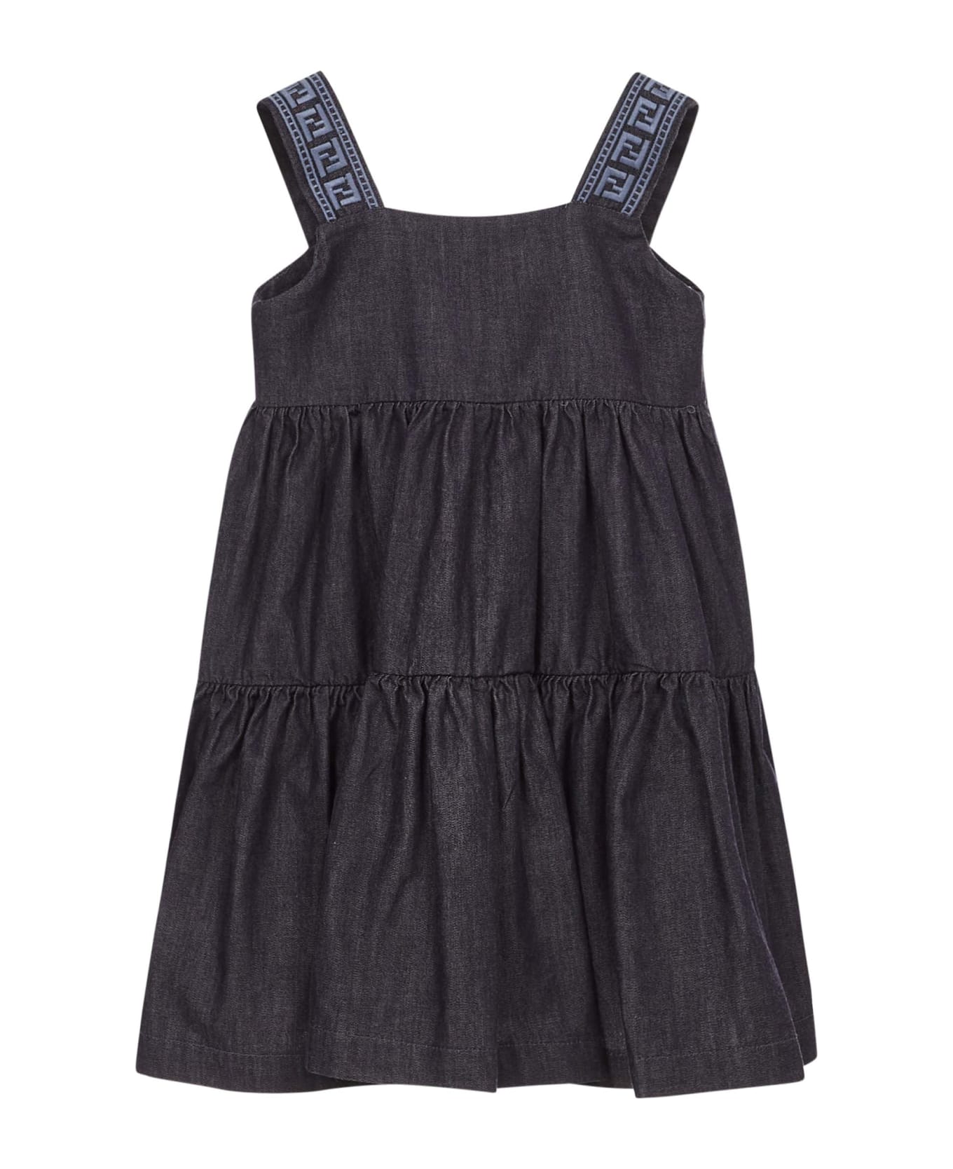 Also in the Fendi Kids collection, one of the main motifs is the FF Karligraphy logo, designed by Karl Lagerfeld in 1981. In this delightful dress for baby girls, it decorates the straps embroidered in blue for an extra accent of coolness and recognizability. The flounced model, in dark blue cotton denim, features a contemporary, glamorous and very comfy silhouette that will take the style of your little ones to the next step, made of practicality and a touch of luxury in full respect of the Maison's DNA.