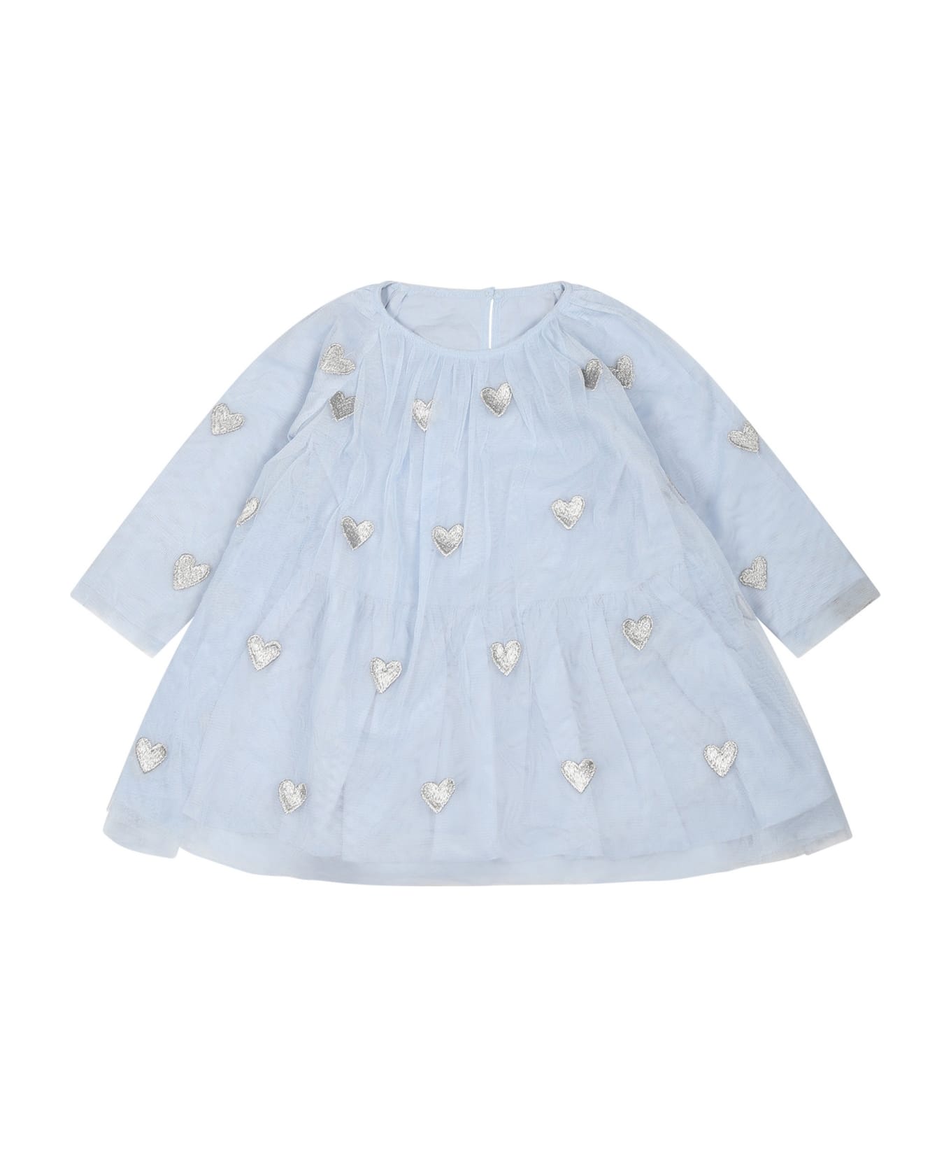 Light blue dress in tulle and recycled polyester, with long sleeves, round neck, button closure on the back, cotton petticoat. It is embellished with all-over embroidered hearts.