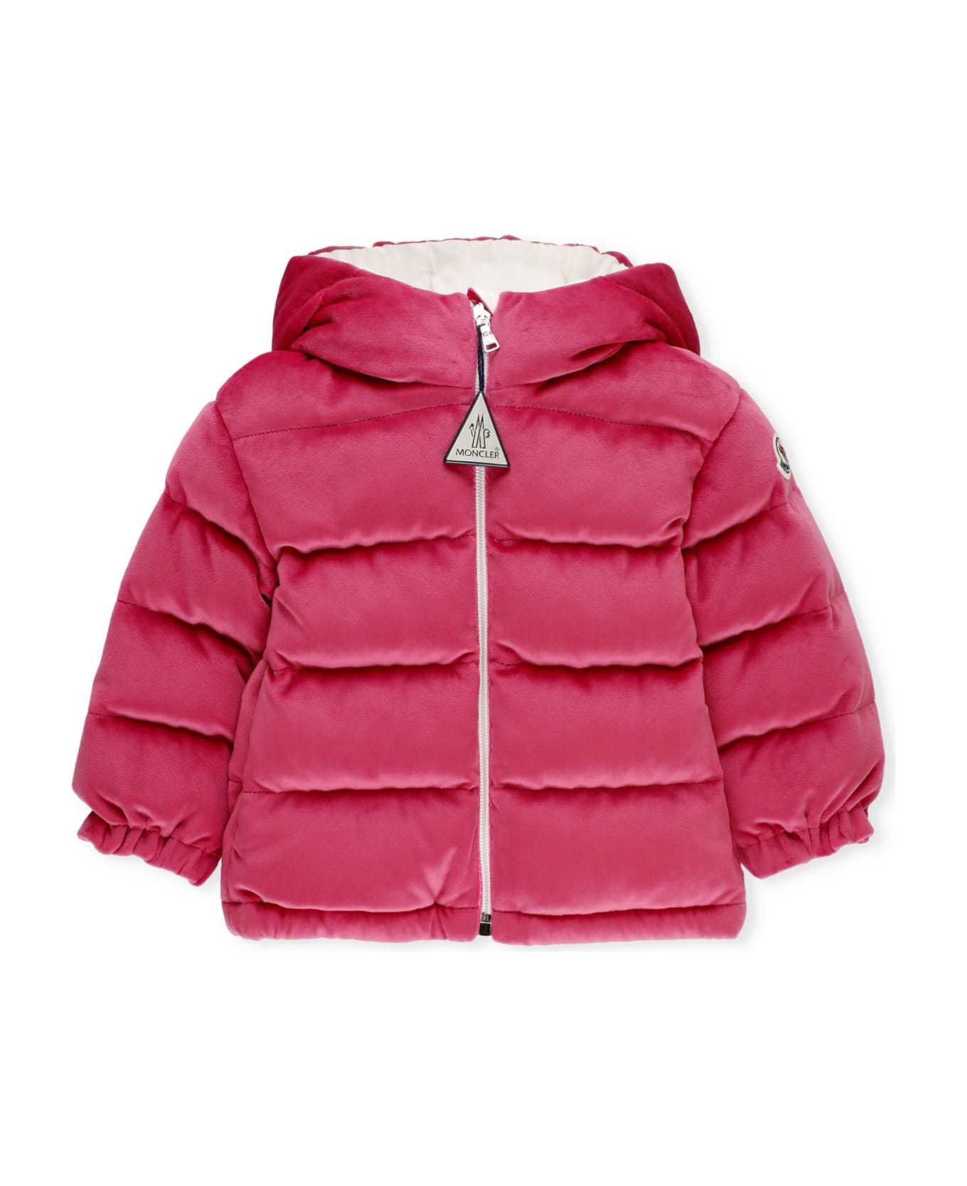 - Fuchsia Moncler Baby padded and quilted down jacket for boy - High neck - Long sleeves with elastic at hem - Hood - Two side button pockets