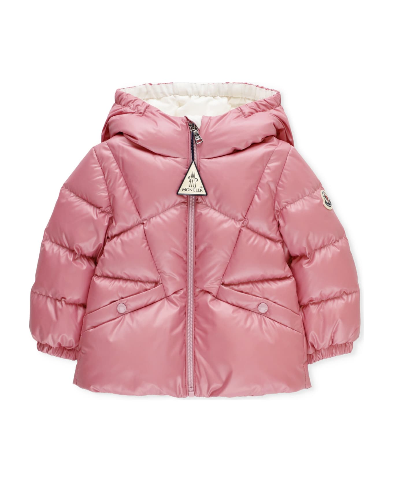 - Pink Moncler Baby padded and quilted down jacket for girl - High neckline with hood - Long sleeves with elastic at cuffs - Front zip fastening - Two front pockets with button
