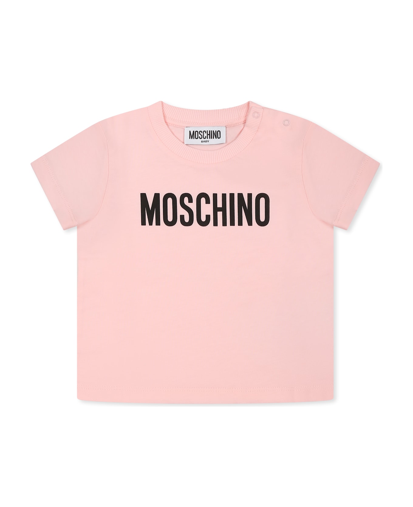 Pink t-shirt from the Moschino Kids brand, made of cotton, with short sleeves, ribbed crew neck and snap button closure on the shoulder. It is embellished with contrasting black logo on the front.