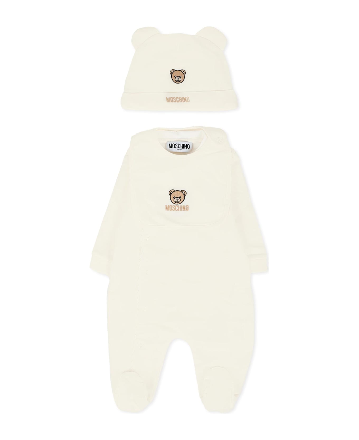 Moschino Kids ivory babygrow set, including a babygrow, hat, and bib. The long-sleeved fleece cotton onesie features a rounded white collar, snap closure, and feet. The hat features a cuff and ears on the top. The bib has a snap button on one side. It is embellished with an embroidered Teddy Bear and logo on the front.