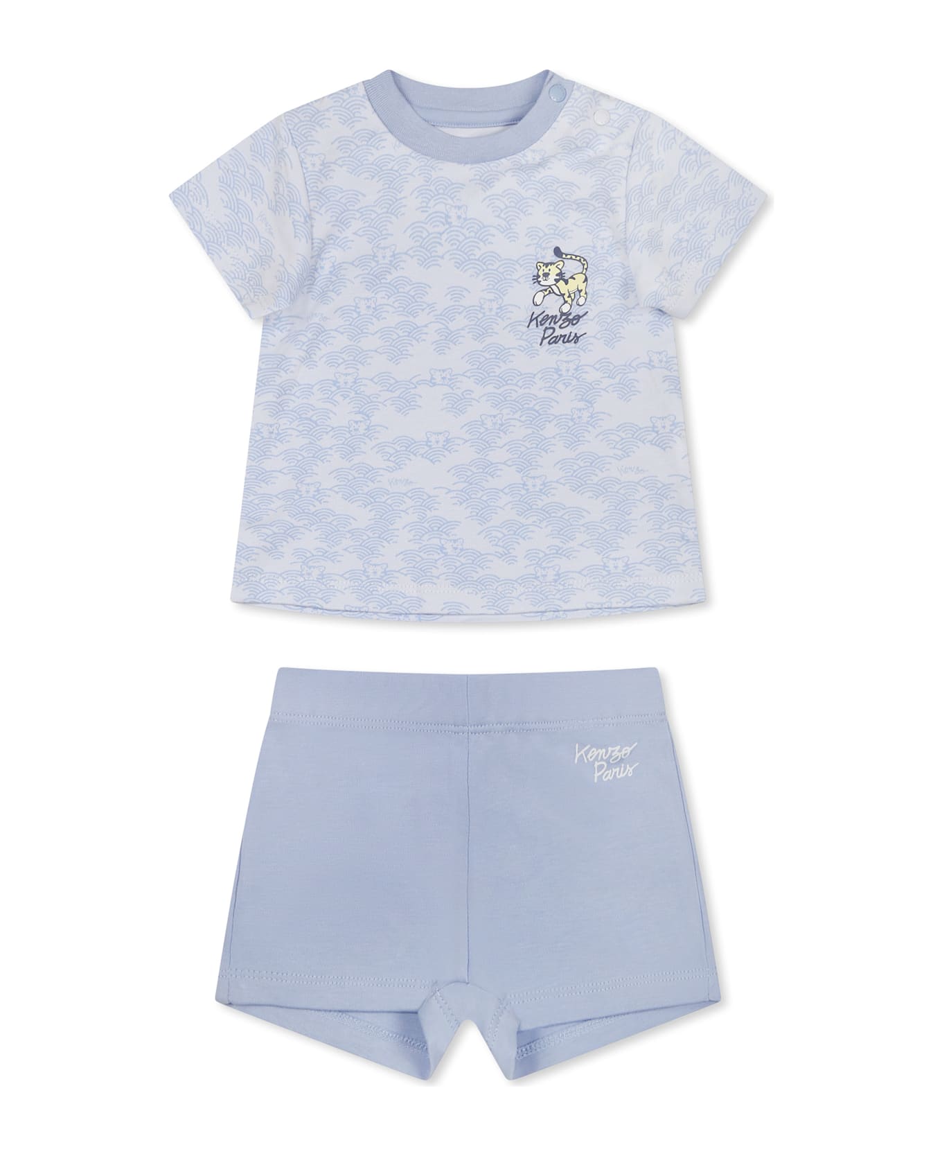 Light blue suit from the French brand Kenzo Kids, in organic cotton, composed of a t-shirt and shorts. Short-sleeved t-shirt, with a ribbed crew neck and snap button closure on the shoulder; it is embellished with an all-over tiger print and with a logo and tiger on the chest. Shorts with an elasticated waist; embellished with a logo on the front.