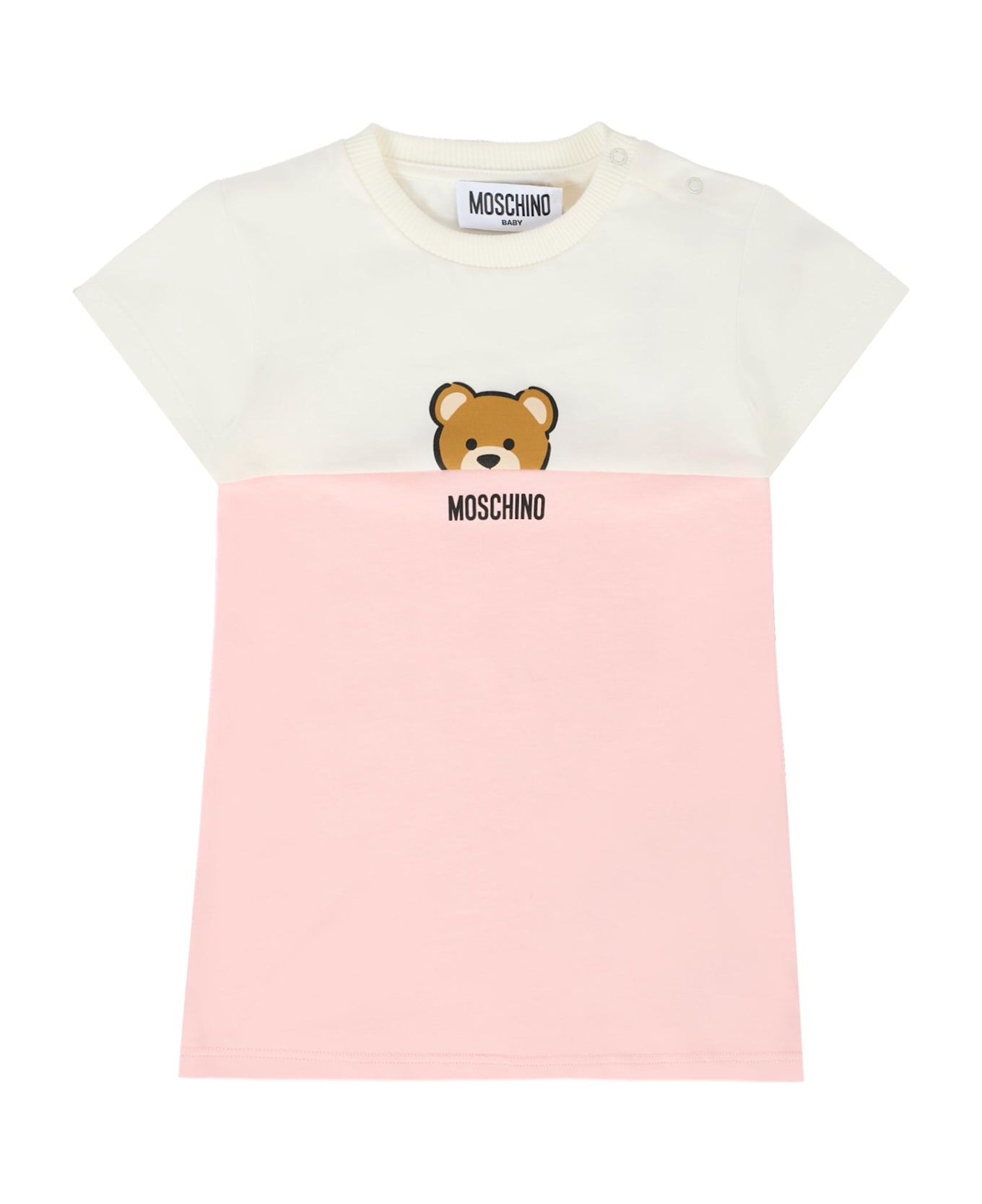 Pink dress from the Moschino Kids brand, in organic cotton, with short sleeves, a ribbed crew neck and a snap button closure on the shoulder. It is embellished with a Teddy Bear print and logo on the front.