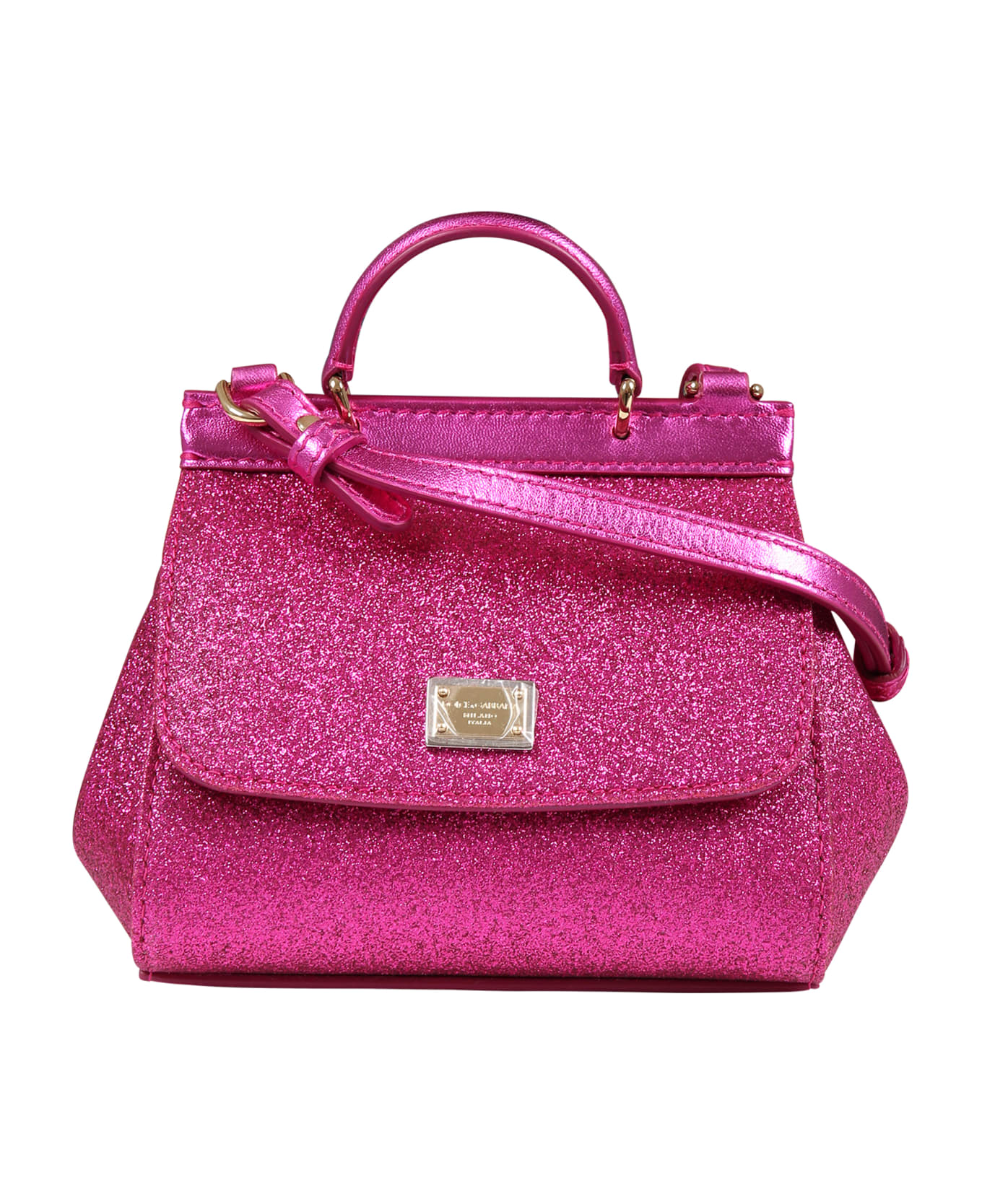 Color: Fuchsia Fuchsia bag with handle, adjustable shoulder strap and closure with clips, on the front. It is embellished with all-over lurex and with golden metallic logo applied on the front. 16 X 14 X 8cm. 55% Polyester, 25% Polyurethane, 20% Leather.