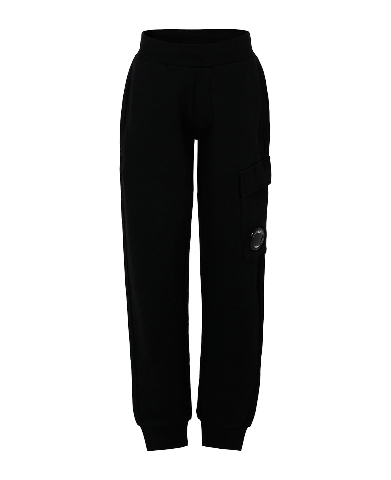 Black trousers in cotton fleece, with elasticated waist, internal drawstring, side pockets, cargo pocket on one side and ribbed ankles. They are embellished with a lens applied on one leg.