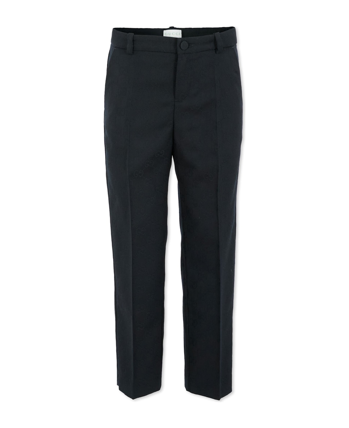 Blue trousers from the luxury brand Gucci Kids, in GG wool jacquard, with belt loops, a front zip and button closure, an adjustable waist with an internal elastic band and buttons, side welt pockets and a back pocket. They are embellished with an all-over GG logo.