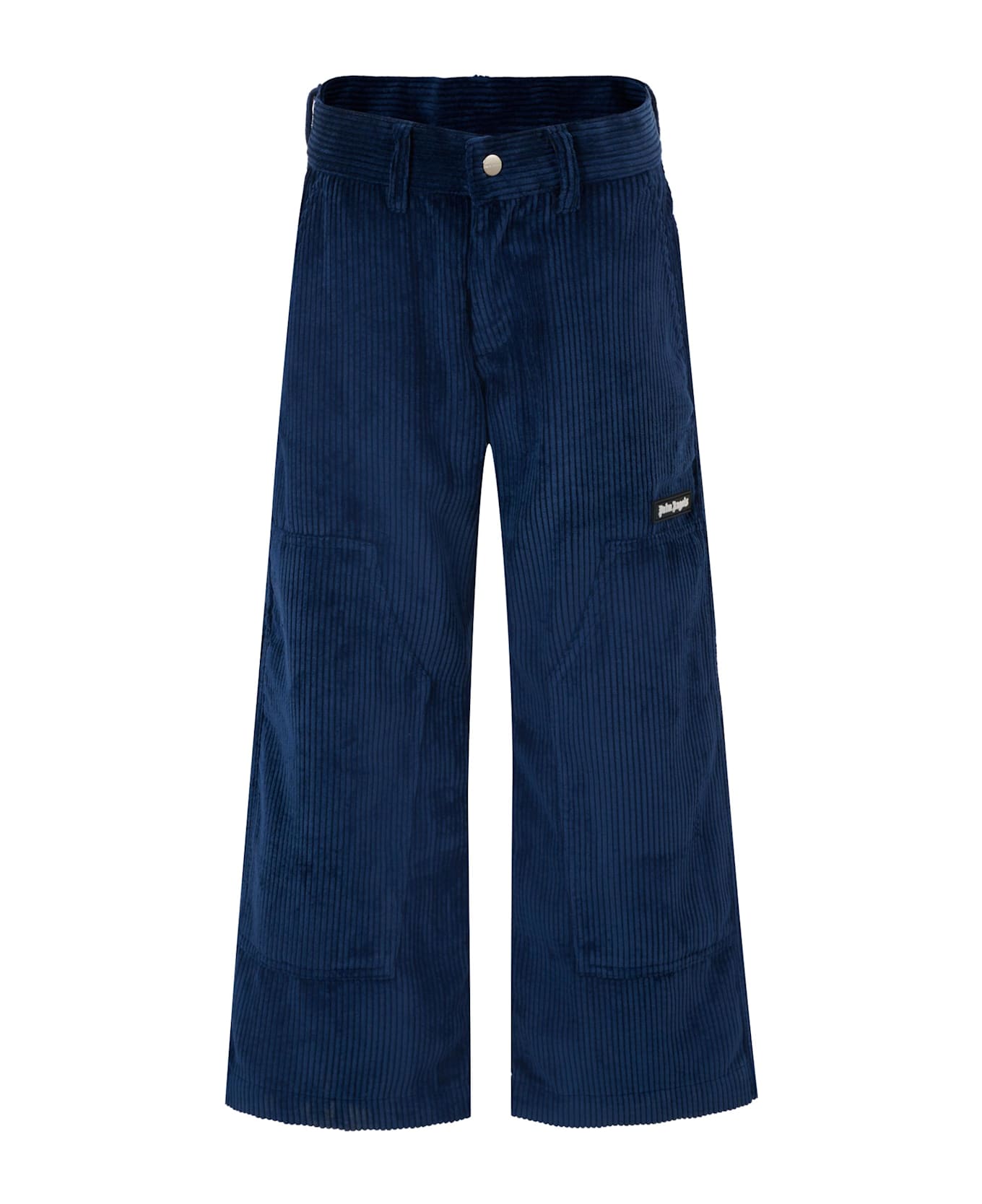 Blue corduroy trousers, with belt loops, front zip and snap button fastening, adjustable waist thanks to internal elastic with buttons, side pockets and back pockets. They are embellished with a rubber logo patch, applied on one leg.