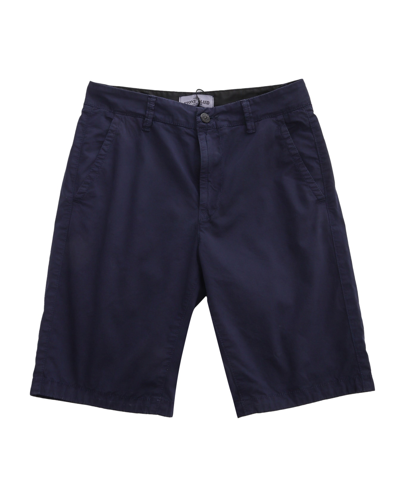 Stretch cotton shorts, slanted pockets, belt loops, welt pocket on the back, logo patch