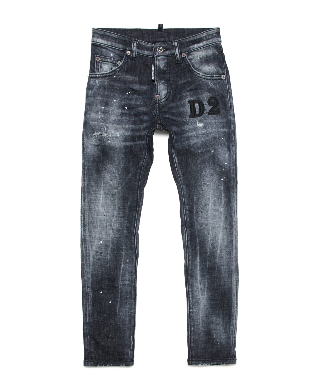 Five-pocket jeans, with skinny fit on the leg, washed black. The garment features small stains, abrasions and the D2 patch applied on the front.