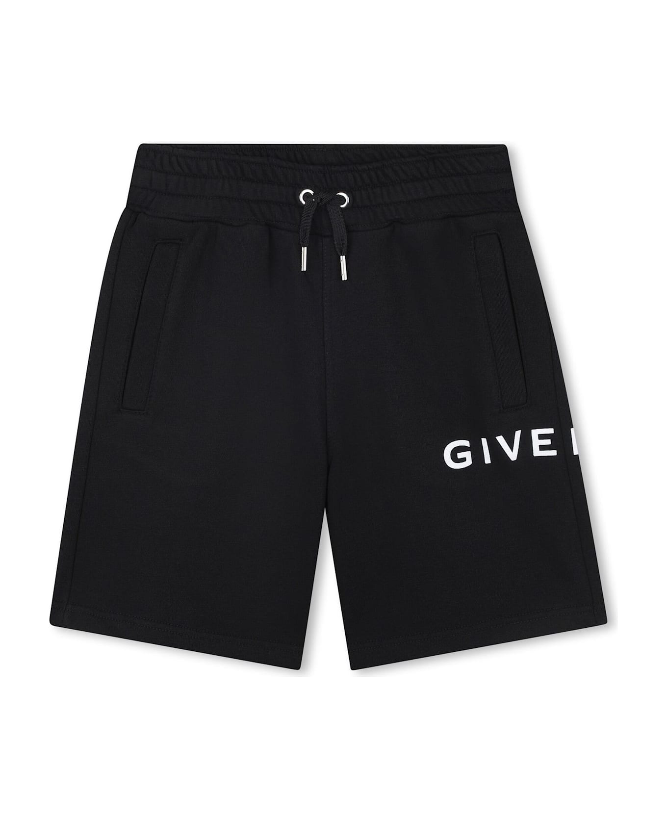 Black cotton blend shorts, elasticated drawstring waistband, two side inset pockets Composition: Organic Cotton, 85% , Polyester, 15%