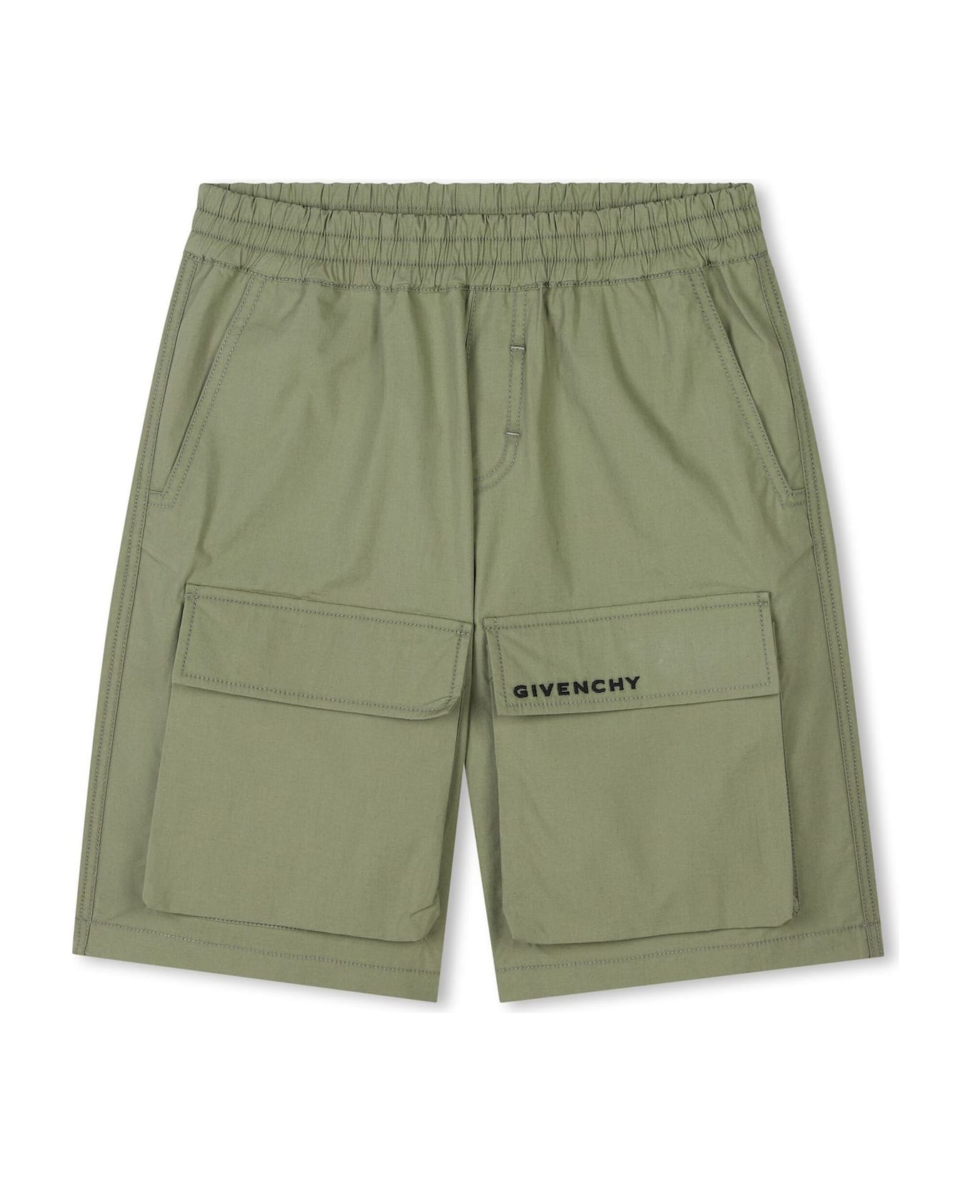 Olive green organic cotton blend shorts, poplin texture, elasticated waistband, two side slit pockets, two front flap pockets, embroidered logo to the front, two rear patch pockets Composition: Organic Cotton, 97% , Elastane, 3%