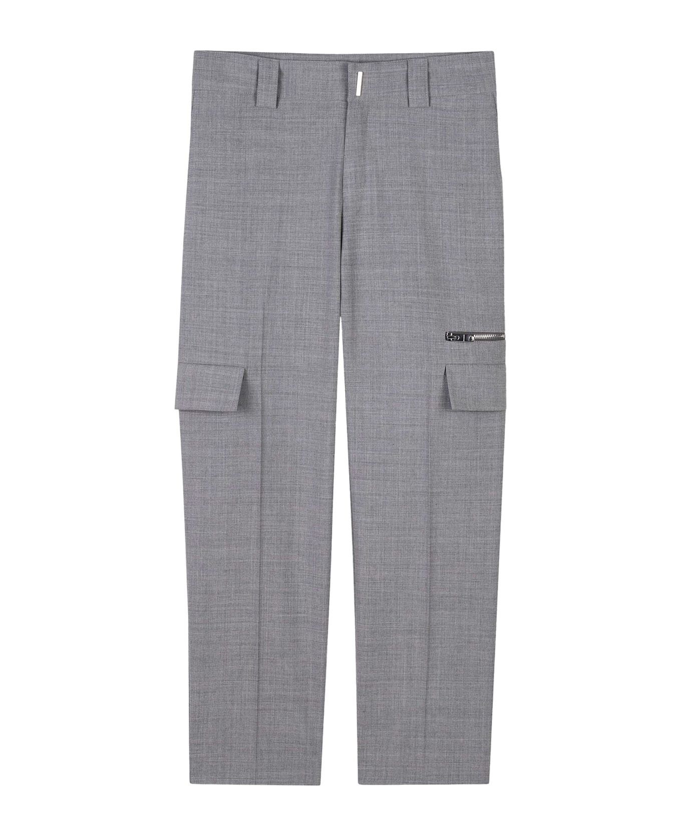 Medium grey wool blend trousers, concealed fly and button fastening, straight leg, belt loops, pressed crease, two side inset pockets, side zip-fastening pocket, two side flap pockets, two rear welt pockets, silver-tone logo plaque, straight hem